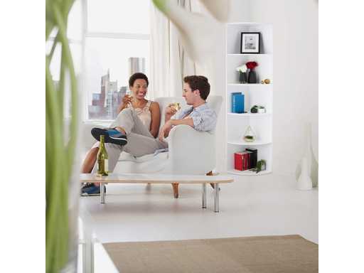 The corner shelf with the 5 half-round tray supports offers plenty of space in the living room
