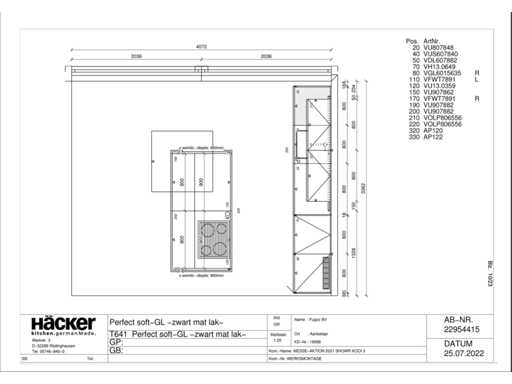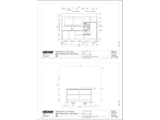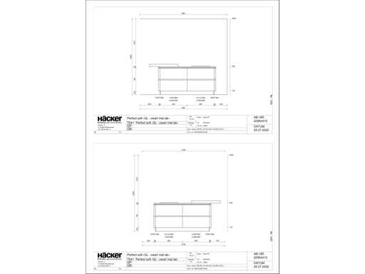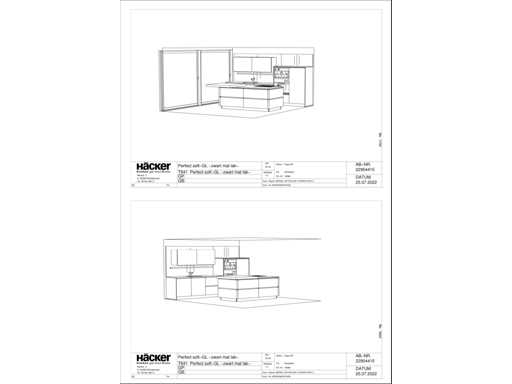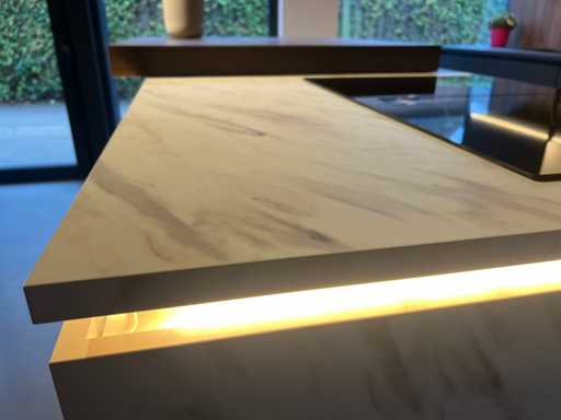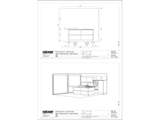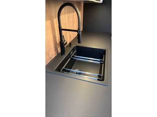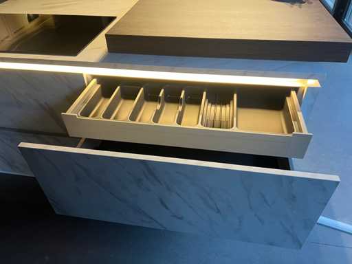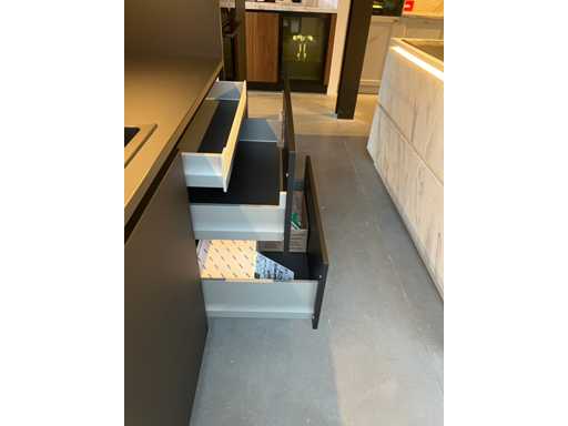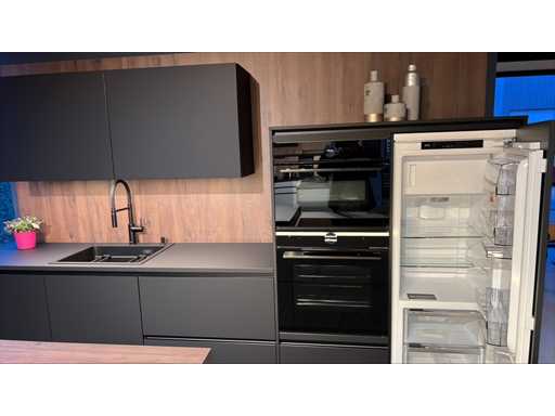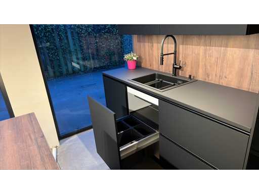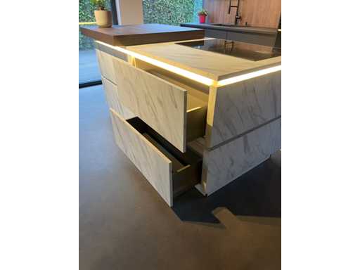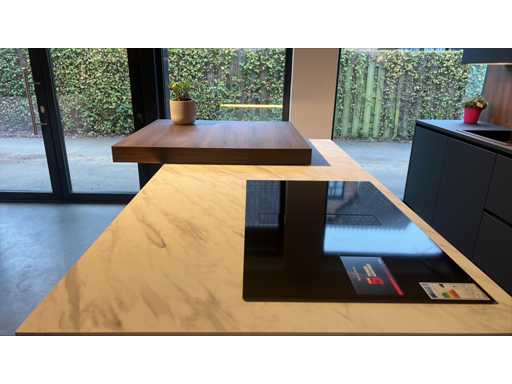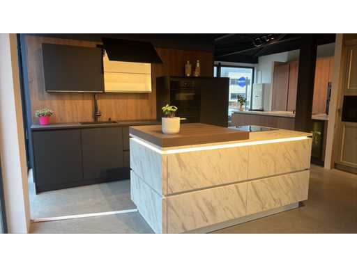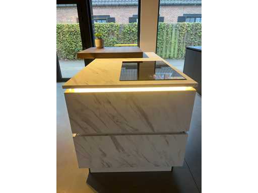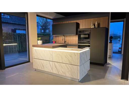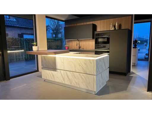 Worktops: Matte black with perfectsense surface and Carrara marble white with perfectsense surface.
