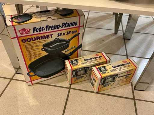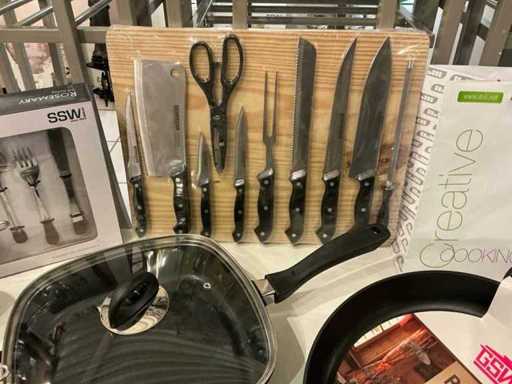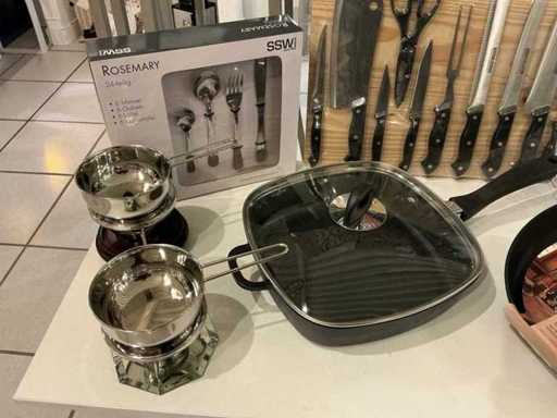 Including 24-piece cutlery set, 3x pan, 1x lid, 2x sauce warmer, and so on