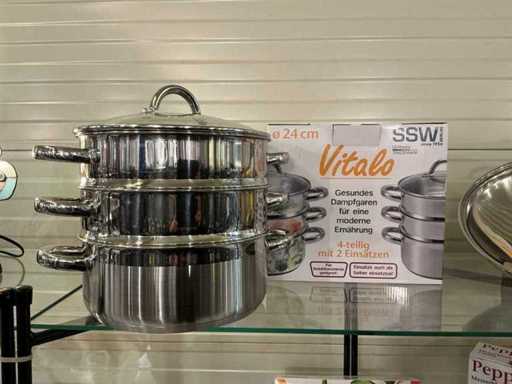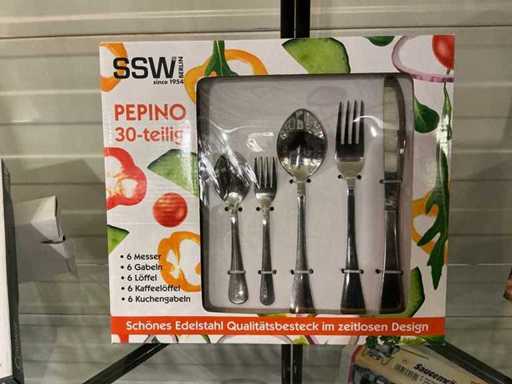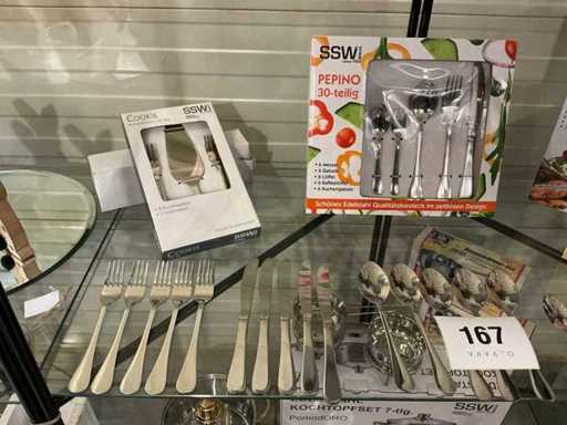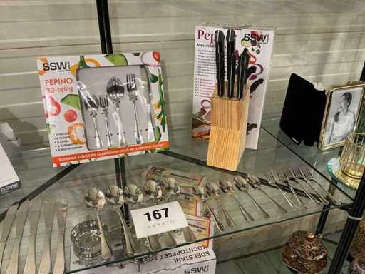 Consisting of 30-piece cutlery set, 1x 7-piece knife block, wok pan and 4-piece cooking pot steamer set