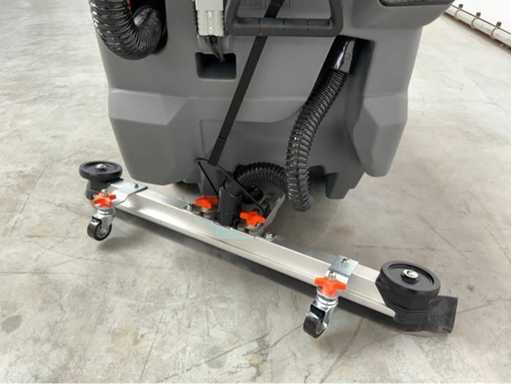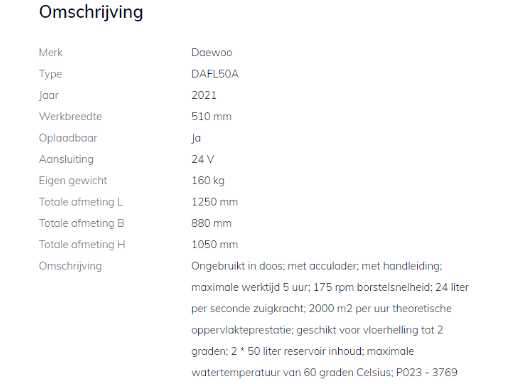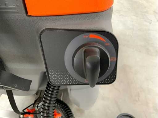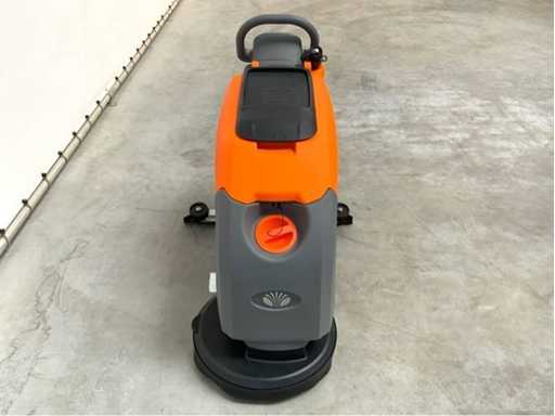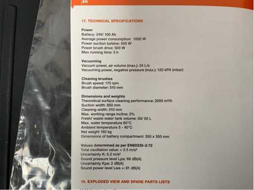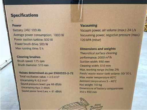 unused in box; with battery charger; with manual; maximum working time 5 hours; 175 rpm brush speed; 24 liters per second of suction power; 2000 m2 per hour theoretical area performance; suitable for floor slope up to 2 degrees; 2*50 liters reservoir capacity; maximum water temperature of 60 degrees Celsius; 3769;