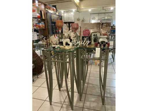 Complete with 3x metal upright with glass top with dimensions approximately 45 x 45 x 90 cm