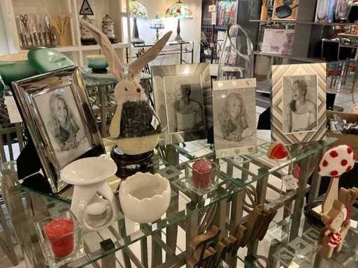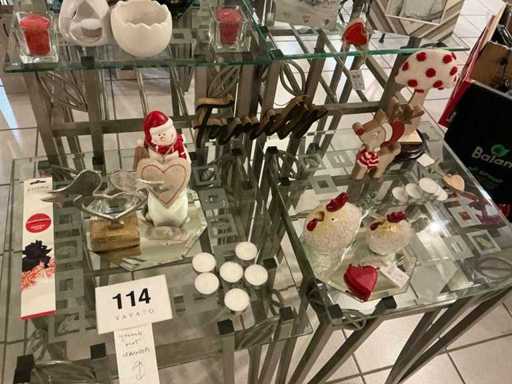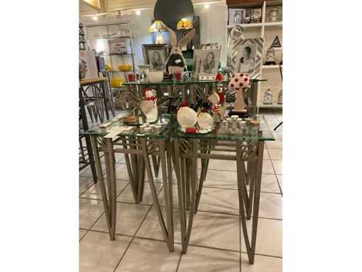 Consisting of seasonal decoration, tealight holders, photo frames, and so on complete with 4x metal upright with glass top including 2x with dimensions approximately 45 x 45 x 90 cm and 2x 45 x 45 x 70 cm