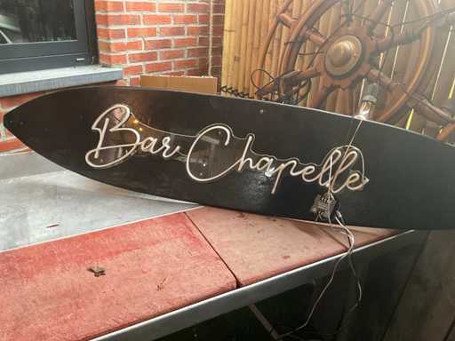 Made of steering wheel of a ship, + matching lamps, + surfboard with néon lighting .m bar Chapelle''
