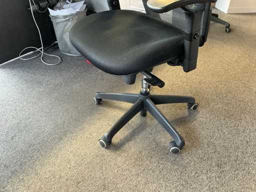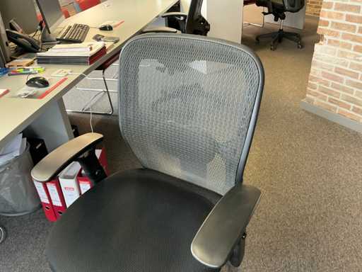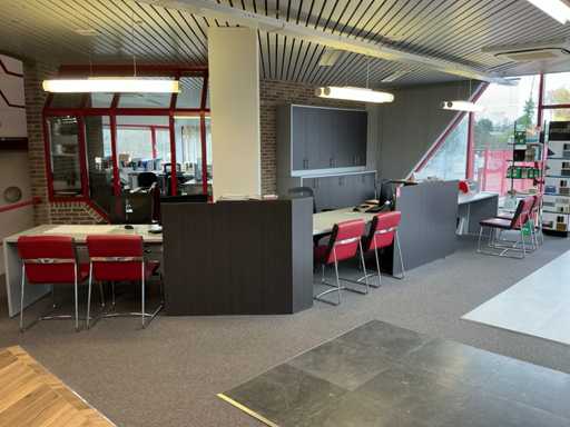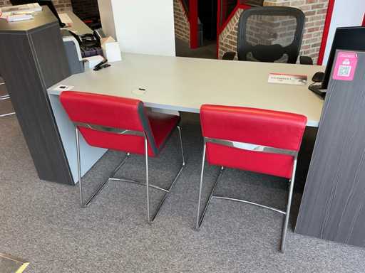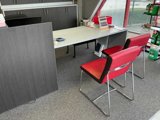 Complete with 6x side chair Leolux with leather seat and metal base, 3x typist chair and 2x wall cabinet each with 6x cabinet doors including 1x with dimensions approx. 250 x 40 x 130cm and 1x with dimensions approx. 250 x 65 x 100cm.