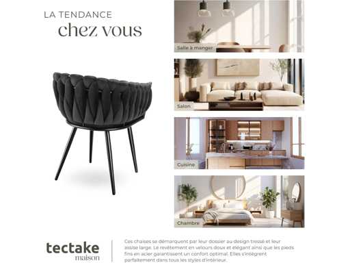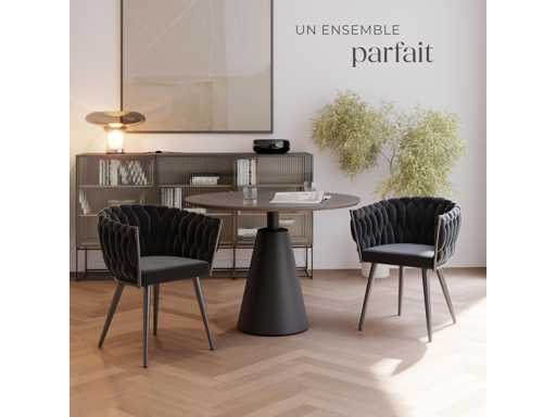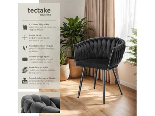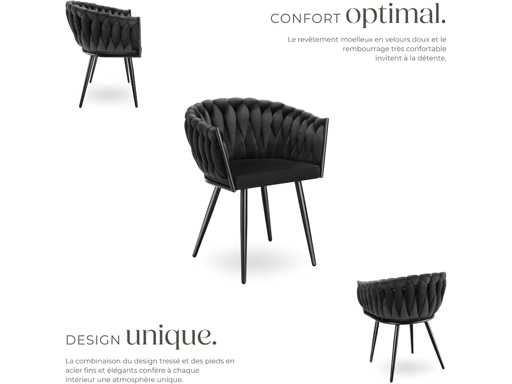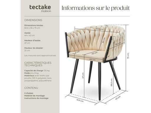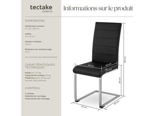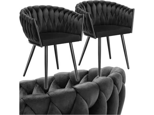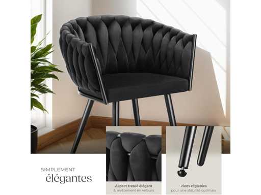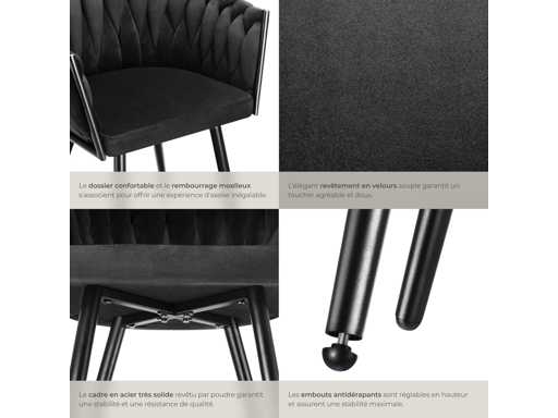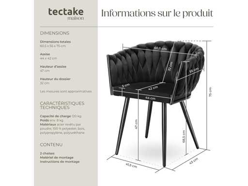 High-density foam padding for outstanding seating comfort Robust frame with slender legs made of elegant black powder-coated steel Absolute stability thanks to height-adjustable, floor-friendly feet Quick and easy to install Easy to care for Colour: black Technical data Total dimensions (WxDxH): approx. 60.5 x 55 x 75 cm Seat surface (WxD): approx. 44 x 42 cm Seat height: approx. 47 cm Backrest height: approx. 32 cm Height of armrests from the floor: approx. 68.5 cm Height adjustment of plastic legs: approx. 1.5 cm Load capacity: 120 kg Weight: approx. 7.9 kg Material: powder-coated steel, 100 % polyester, wood, polypropylene, polyurethane Scope of delivery 2 dining chairs Assembly material Assembly instructions Information: Assembly: to assemble yourself Assembly: to assemble yourself