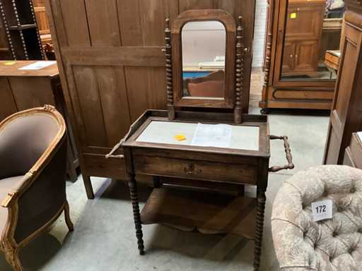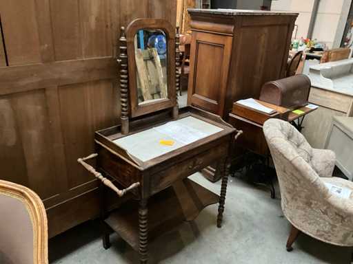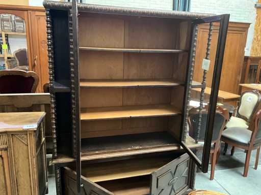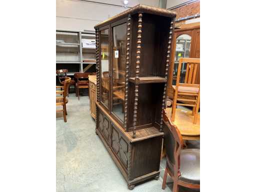 Equipped with double glass door, 4x shelves, 2x wooden door below, +1x make-up cabinet with drawer and shelf
