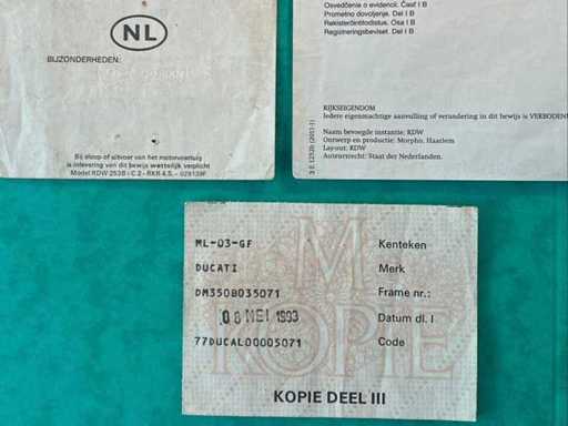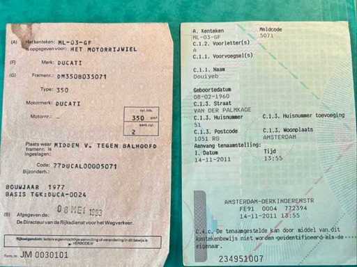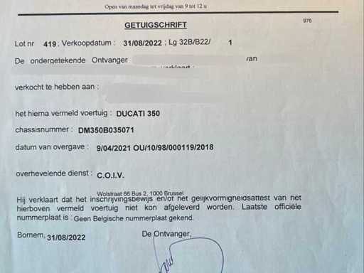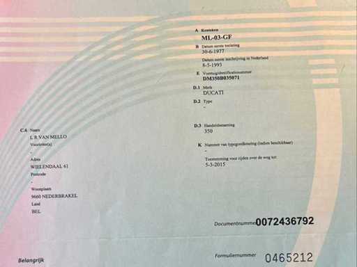 Stored on the road. Check-up required. Ducati 350 classic motorcycle, first registered on 30/06/1977. This example is offered in an attractive red version with black seat and wire wheels and has the typical lines of the Ducati models from the seventies. The odometer shows a mileage of 15,207 km. The chassis number according to the documents presented is DM350B035071. Various documents are available, including an older Dutch registration certificate, a Belgian registration document and a certificate. The bike shows a neat and complete overall impression, including tank badges, side panels with "350" designation, exhaust, suspension, counter and brake components. The paint and body parts show normal signs of wear and age. Visible traces of age, use and standstill are also present on metal parts, counters, rims, tyres and finish. The tyres show ageing and wear and should be assessed by the buyer with a view to further use. This is an interesting basis for the classic Italian motorcycle enthusiast, collectors or candidate restorers. Thanks to its recognizable Ducati appearance and available documentation, this is an attractive collector's item with potential.