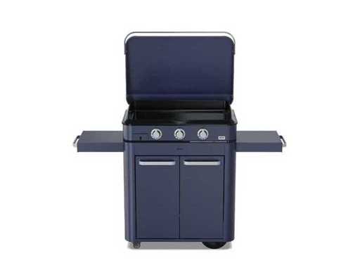 Griddle • Double-walled cast iron 7 mm • Multi-layered enamel • High anti-splash edge • Drainage channel • Cooking surface 69 x 40 cm Gas burners • 3 round gas burners - 6.3 kW • Buttons with integrated electronic ignition • One-handed electronic ignition • Thermocouple safety • Propane, butane or natural gas (Natural gas connection kit optional) Carcass • Galvanized steel, powder-coated Blue Navy • 4 adjustable legs • 1 stainless steel collector 0.7 L with level indicator Trolley • Structure: galva steel powder-coated Blue Navy • Equipment: 2 doors with aluminium handle, black 4 wheels of which 2 are all-terrain and 2 roller wheels with brakes 2 extendable work tables with handle