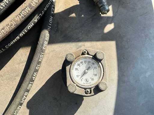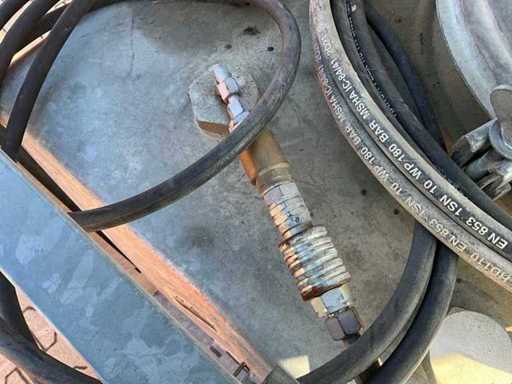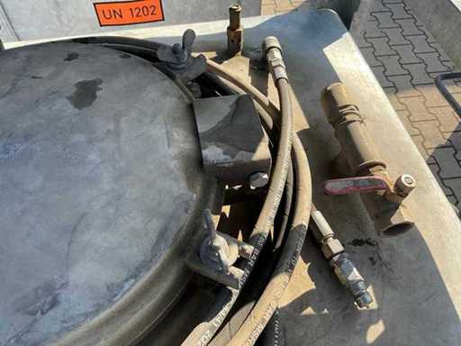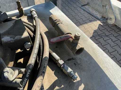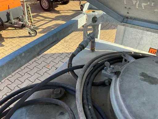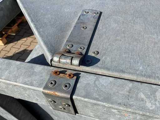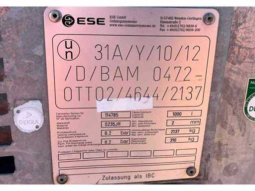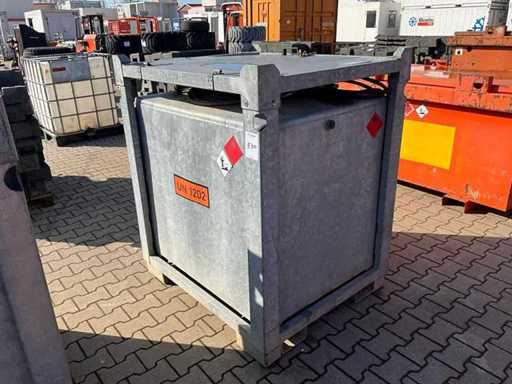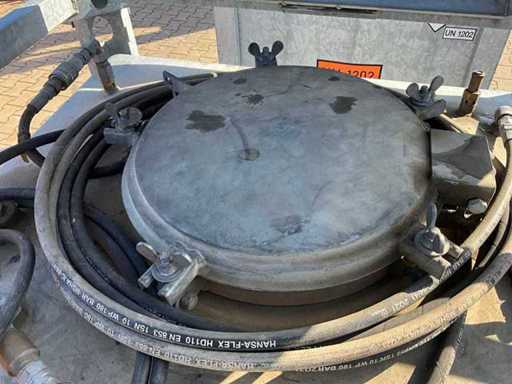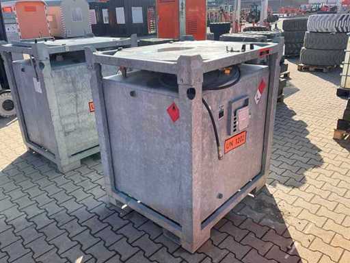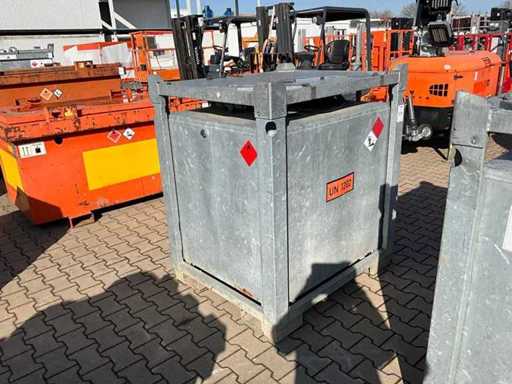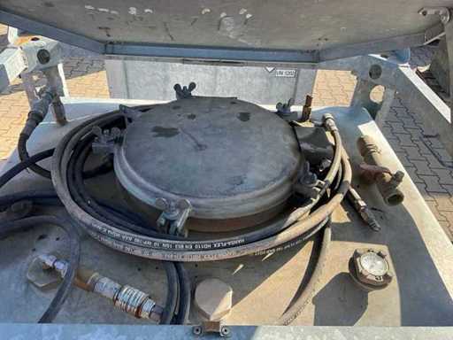 Galvanized steel; wall thickness 2 mm; lifting eyes; forklift fork slots; fill level meter; hoses; hinged lid; 1x sealing cap; manhole; stackable; working condition not verified;