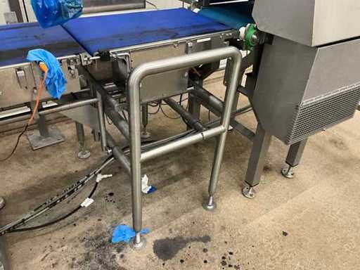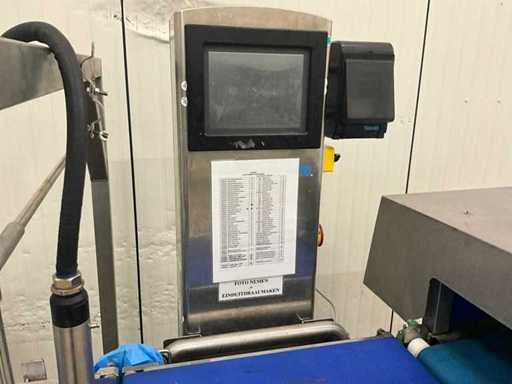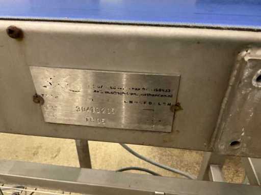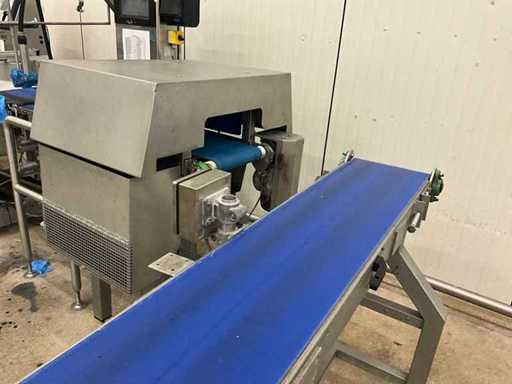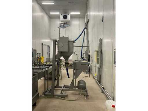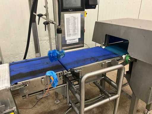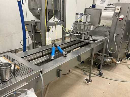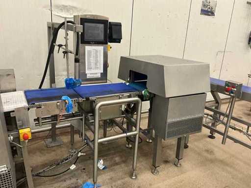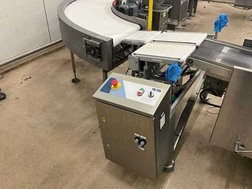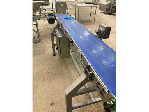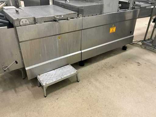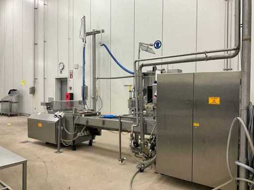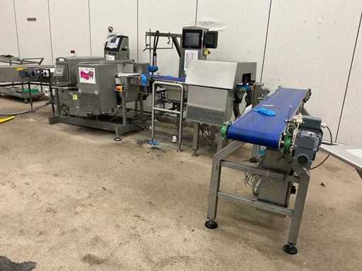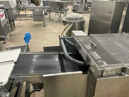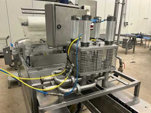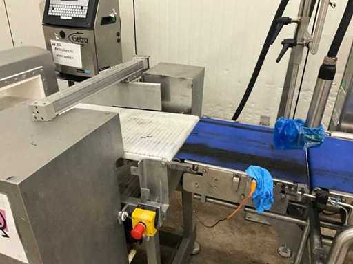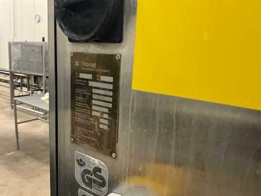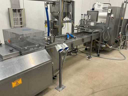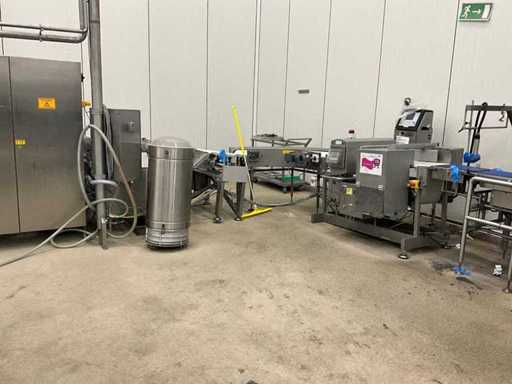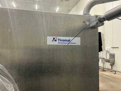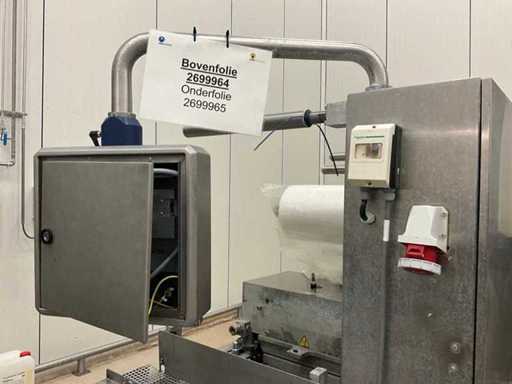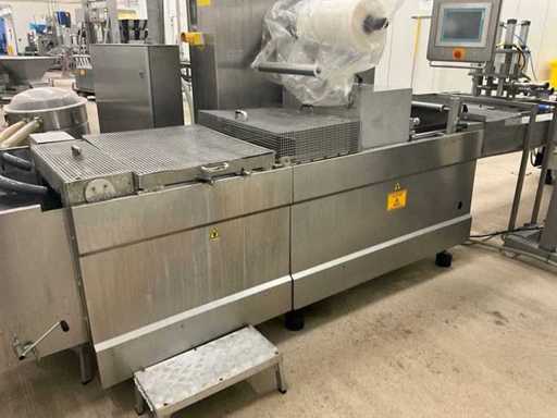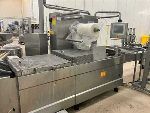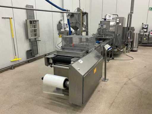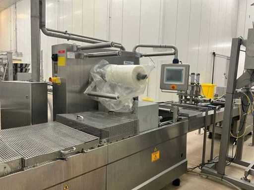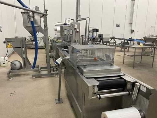 Consisting of bottom and top film packaging machine thermoformer Tiromat F301 (thermoforming machine) with supply line, this form-fill-seal machine is equipped with a feed pump on a stand including a mobile dosing pump/device on compressed air, equipped with conditioning applications, complete with discharge belt and inliner TELTEK LS100, curved discharge belt in rotation shape KRAMER & DUYVIS P100, metal detector Safeline Signature/Mettler Toledo with code printer/small character inkjet printer GETRA Videojet 1520 equipped with roller conveyor, and extra conveyor belt with compact automatic multi-head combi-weigher YAMATO CMG06LW, small tunnel conveyor belt and discharge belt Euronorm TR05 with motor and control panel. Measured in the U-shape arrangement and the maximum height except for the upright of the pump (= approximately 4 m high). Total approximately 15 lpm for the entire set-up.
