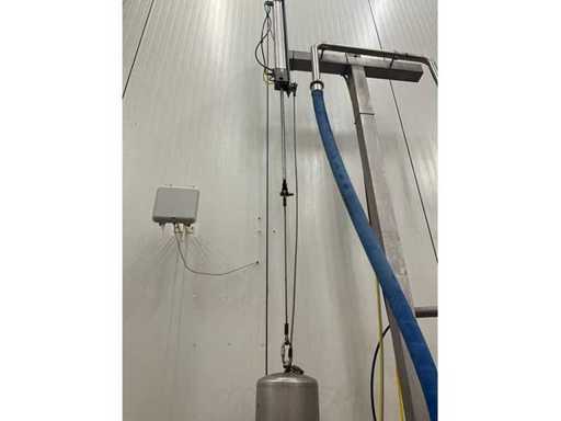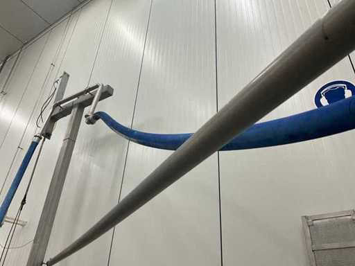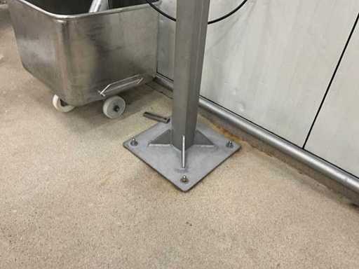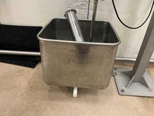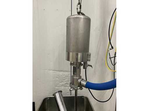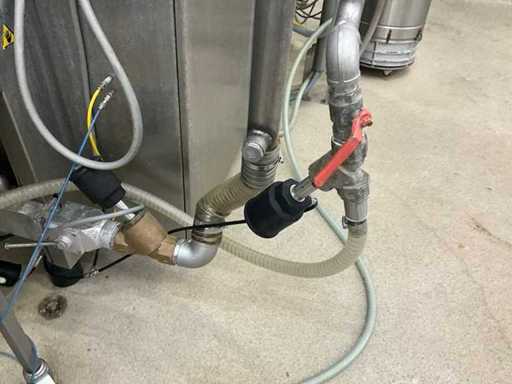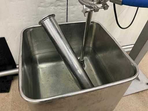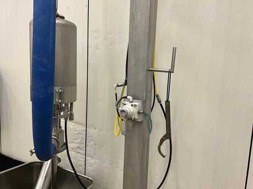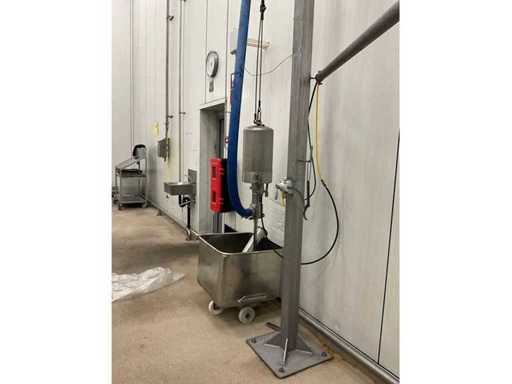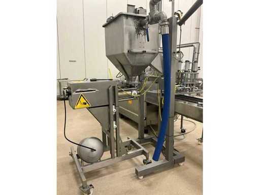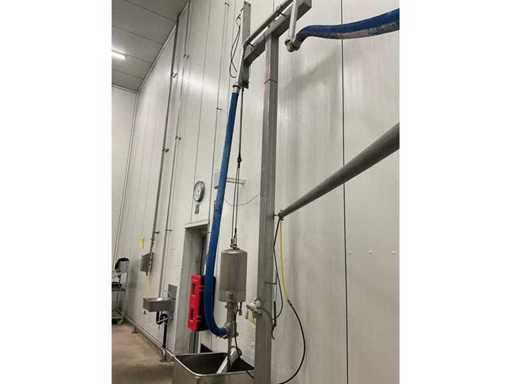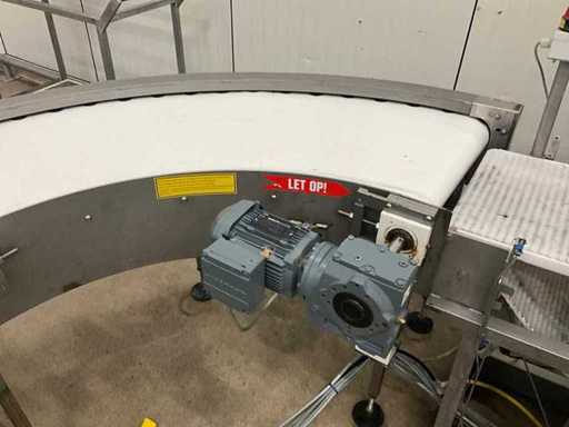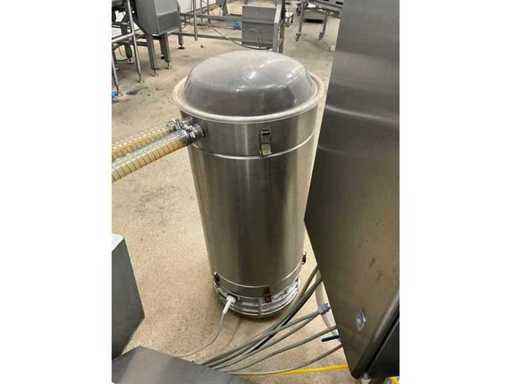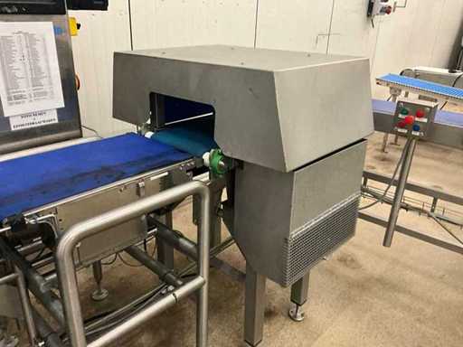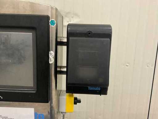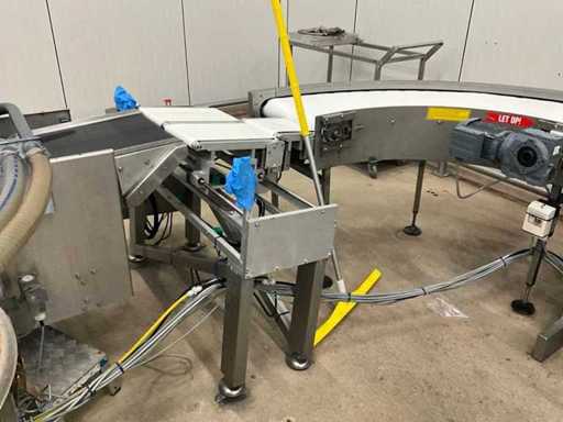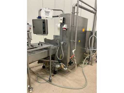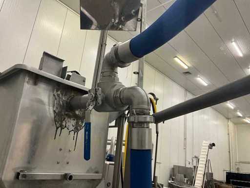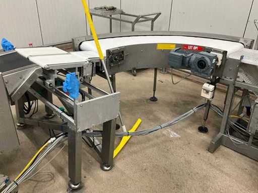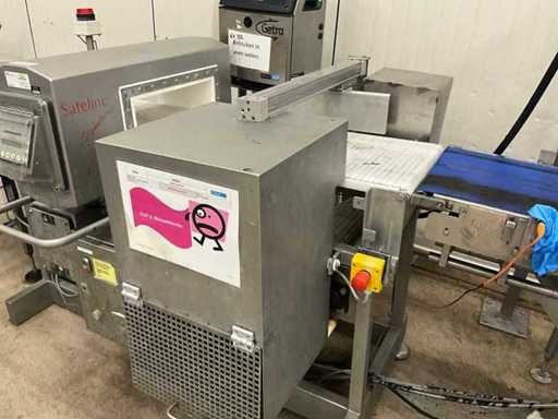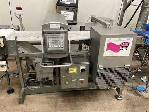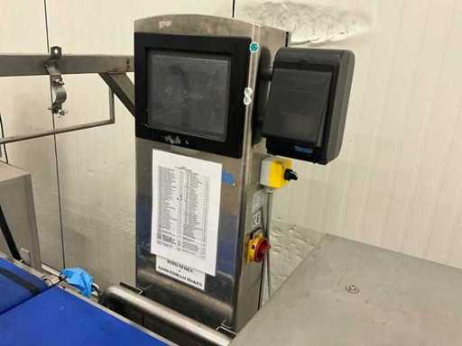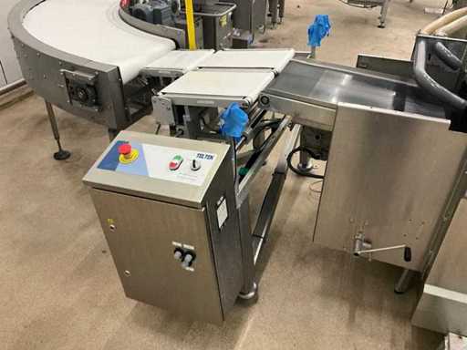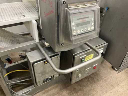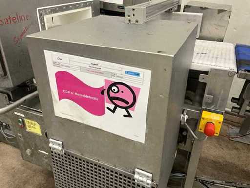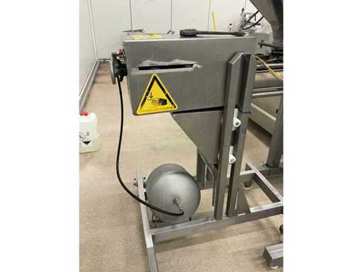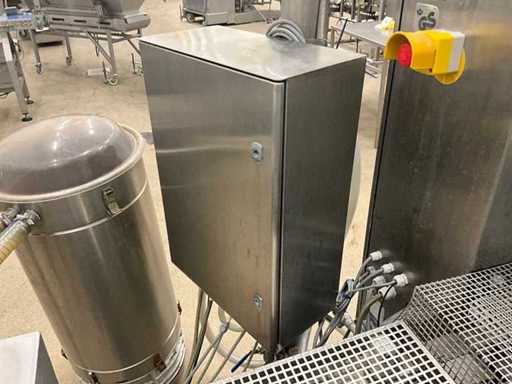Consisting of bottom and top film packaging machine thermoformer Tiromat F301 (thermoforming machine) with supply line, this form-fill-seal machine is equipped with a feed pump on a stand including a mobile dosing pump/device on compressed air, equipped with conditioning applications, complete with discharge belt and inliner TELTEK LS100, curved discharge belt in rotation shape KRAMER & DUYVIS P100, metal detector Safeline Signature/Mettler Toledo with code printer/small character inkjet printer GETRA Videojet 1520 equipped with roller conveyor, and extra conveyor belt with compact automatic multi-head combi-weigher YAMATO CMG06LW, small tunnel conveyor belt and discharge belt Euronorm TR05 with motor and control panel. Measured in the U-shape arrangement and the maximum height except for the upright of the pump (= approximately 4 m high). Total approximately 15 lpm for the entire set-up.