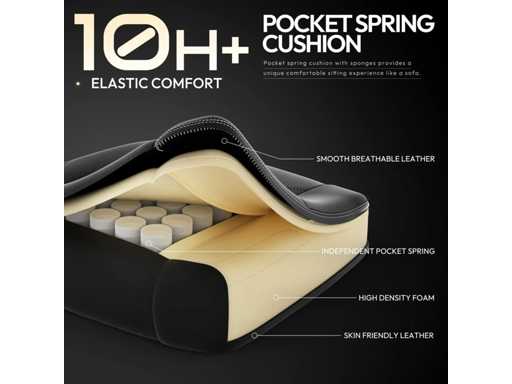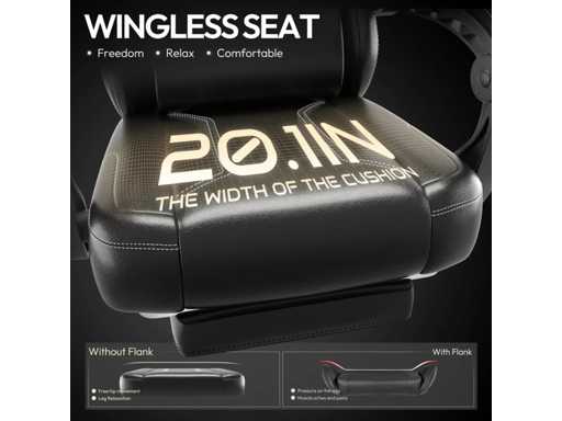 Advanced Spring Cushion Technology: Provides sofa-like comfort that conforms to your body. Optimized seat: The wingless design allows for freedom of movement. Ergonomic design: oversized headrest, built-in massage, and back storage pouch. Adjustable comfort: The backrest adjusts from 90° to 145° with extendable footrest and stable gas spring.