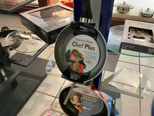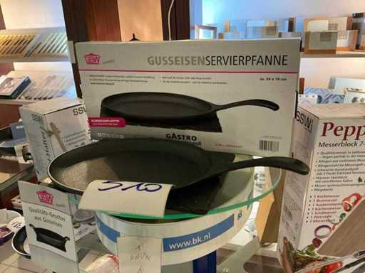 4 x frying pans in various sizes, 1 x crepe pan with dough dividers, 1 x cast iron serving pan with trivet