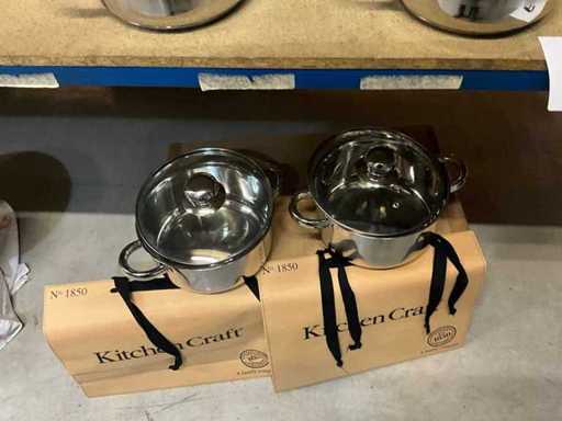 4 x cooking pot various sizes with glass lid with bumper, 1 x saucepan, 2 x saucepans with warmer...