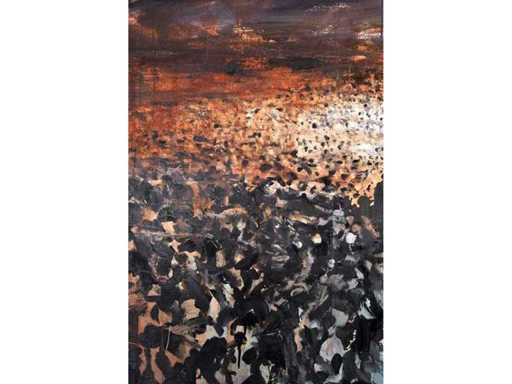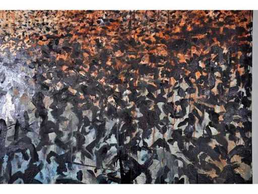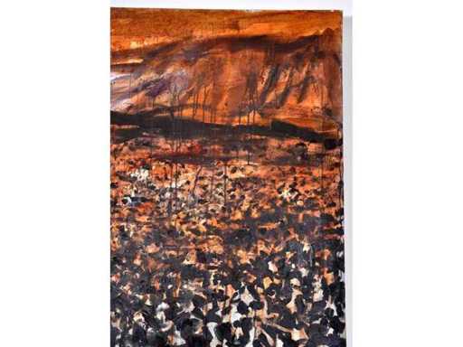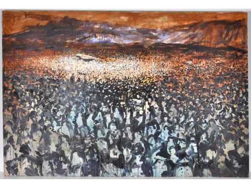 Expressive depiction of a crowd in a mountainous setting, with dramatic lighting and collective tension.