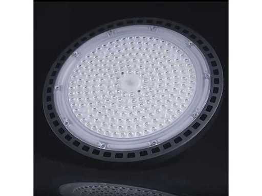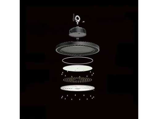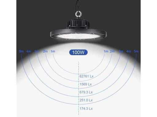 20 x Highbay UFO 100 Watt LED in PRO design offers high efficiency with 12,000 lumens at 100 lumens per watt - Equipped with Professional LED for superior brightness and reliability - Dimmable with a switch that offers 3 different modes: 60%/80%/100% power - Powered by a high-quality Lifud driver, which guarantees stable performance - Cold white light at 6500K for bright, clear lighting - Waterproof with an IP65 rating, ideal for both indoor and outdoor use - Dimensions: Ø 260mm x 102mm for easy installation - Durable die-cast aluminum construction with a PC lens, with a lifespan of 30,000 hours - 90° radiation angle for wide light coverage - Energy efficient with a power factor >0.95 - High CRI >80 for accurate color rendering - Compatible with 110-265V - Comes with 5 year warranty for peace of mind - Low maintenance due to the Long lifespan - Efficient heat dissipation prevents overheating - Environmentally friendly and cost-effective, reduces energy bills - Provides flicker-free, stable light.