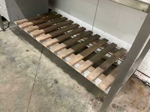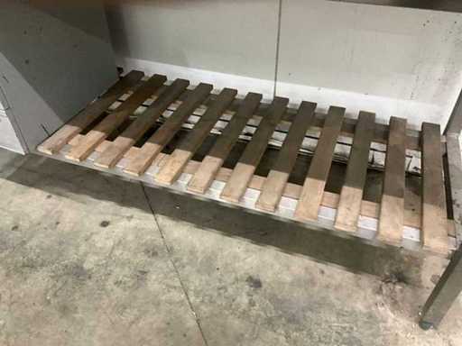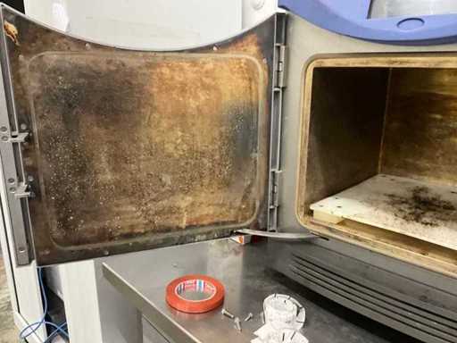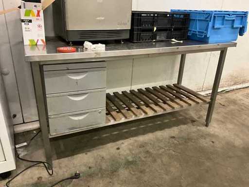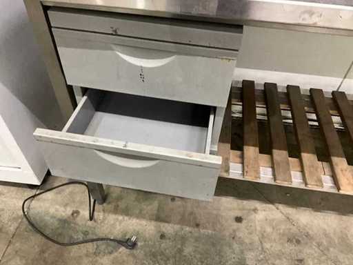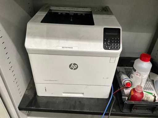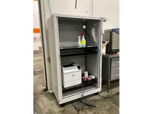 Printer HP type LaserJet Enterprise M604, complete with mobile metal filing cabinet of approximately 100x60x172 cm high with 2 roller shutter doors, and some shelves, stainless steel work table 175 x 70 x 93 cm high with 1 level with wooden shelves at the bottom and 3-slide drawer unit and old oven Celsius (operation unknown).