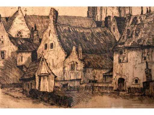 Finely crafted cityscape with the beguinage of Kortrijk and surrounding historic architecture - Professionally framed