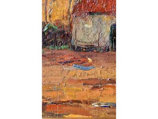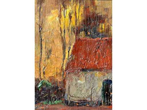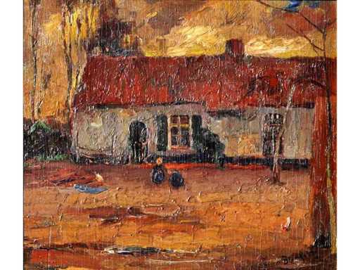 Illegible signature - Farm view with children - oil on panel - 38x44 cm