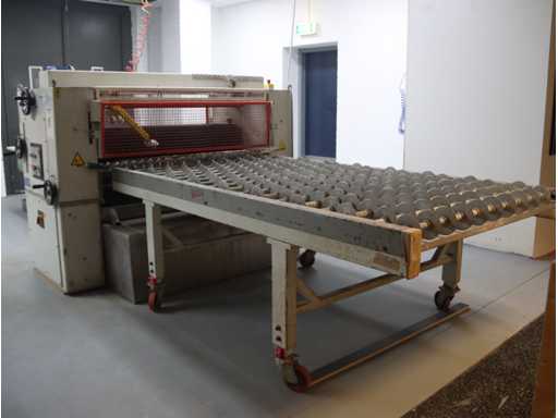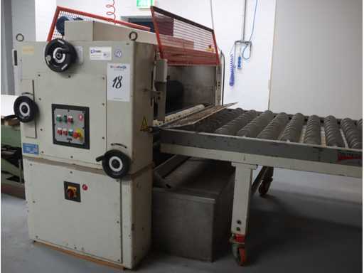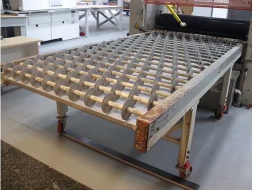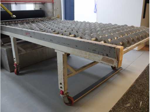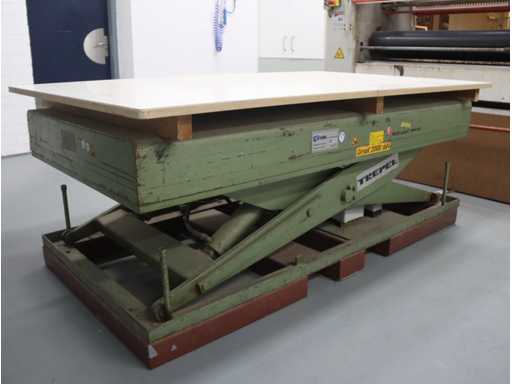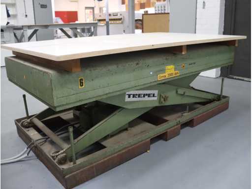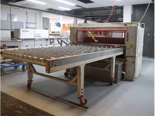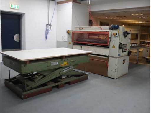 equipped with 4 rollers; top and bottom glue divider; incl. mobile output table; Afm. approx. 1400x2550; with "Trepel" scissor lift table; Max. load 2000 kg; Table dimensions. approx. 2040x1220 mm