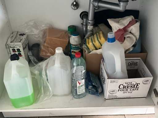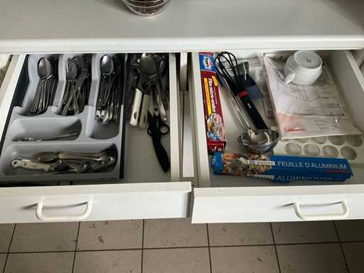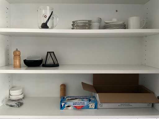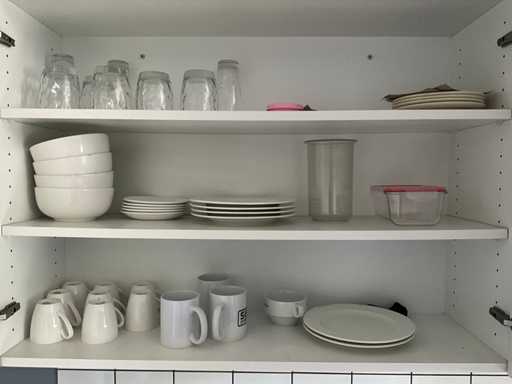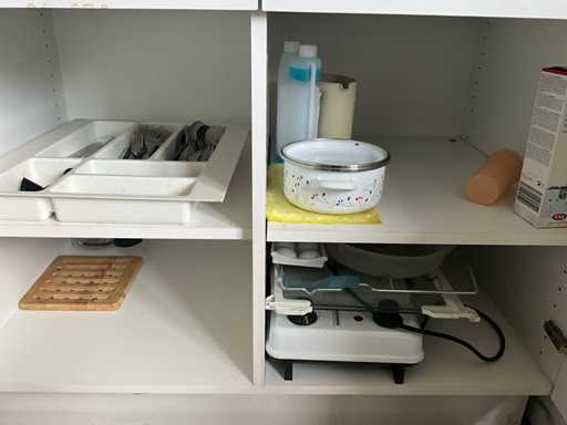 Remaining contents of kitchen cabinets including various bags, mugs, glasses, cutlery, some maintenance products and electric stove with 2 hotplates.