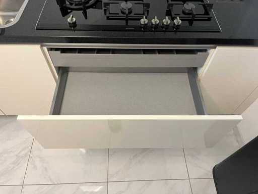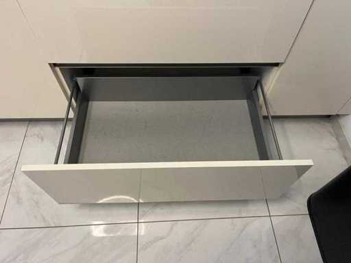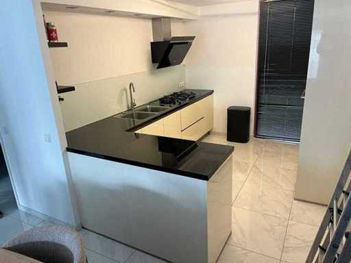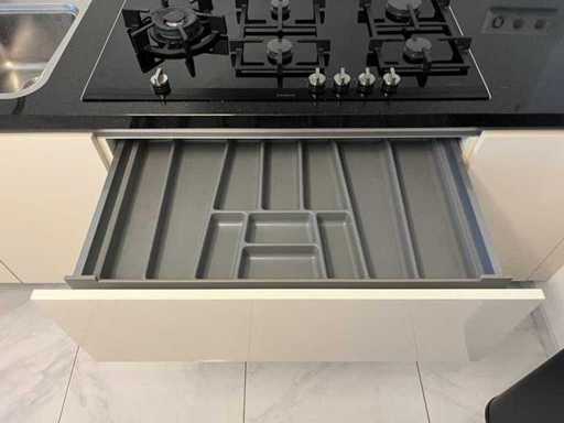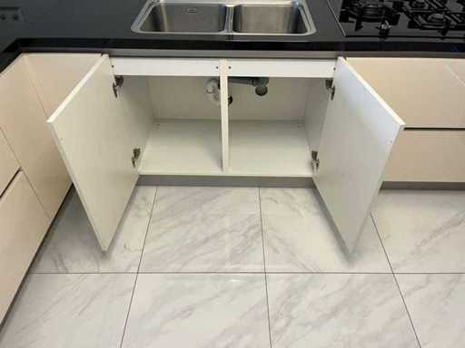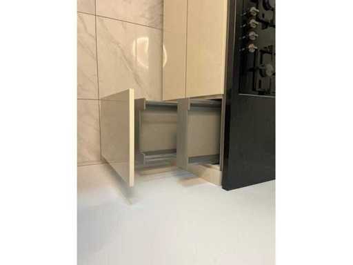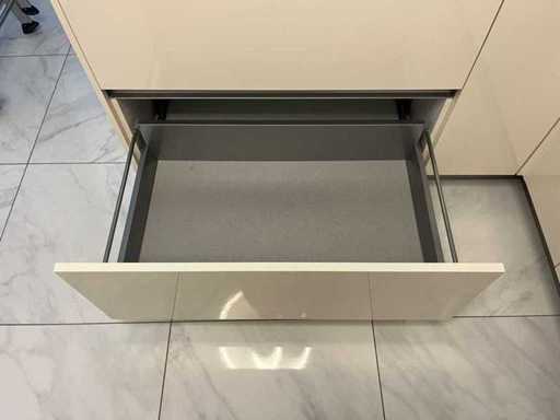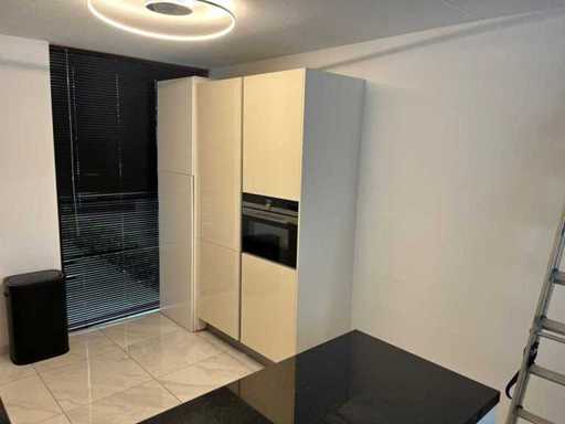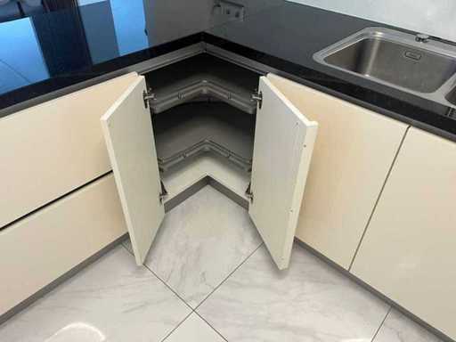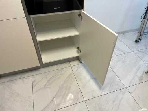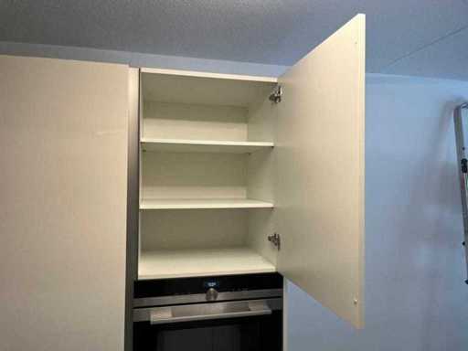 Condition: used; dimensions left part approximately 184x60x90 cm; dimensions right part approximately 330x60x90 cm; dimensions cupboard wall approximately 126x60x215 cm; already disassembled and packed on pallets. (stacking, exchange or deposit per pallet); pallets are not included; pay a deposit when picking up, or stack pallets; Worktop not packed on pallets (26-2DE-03993)