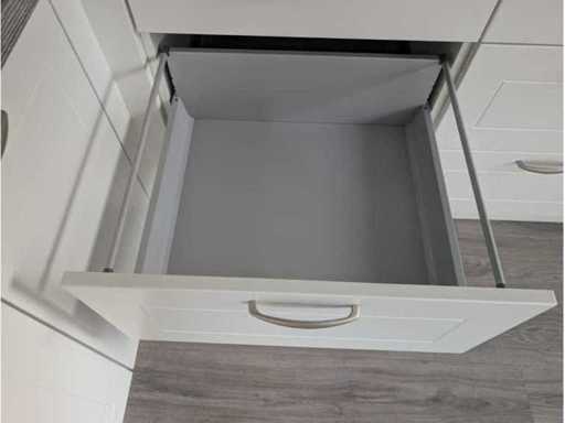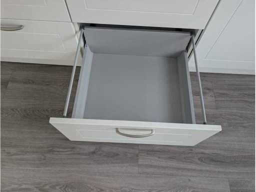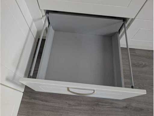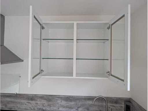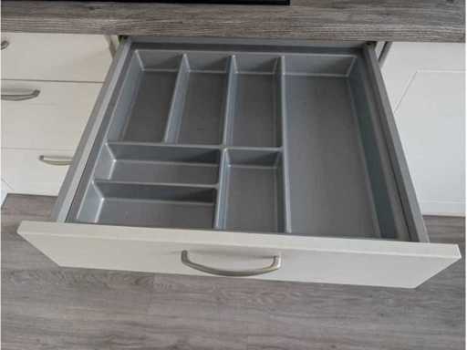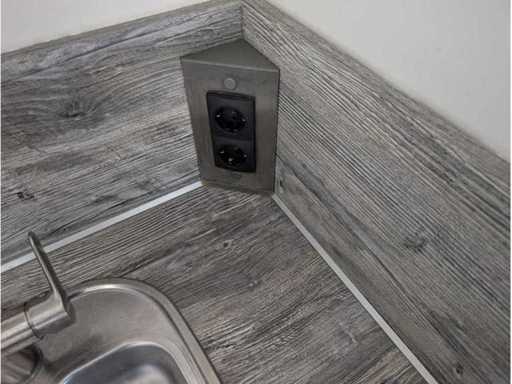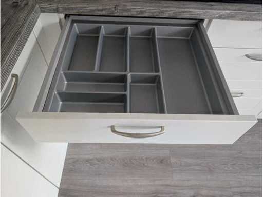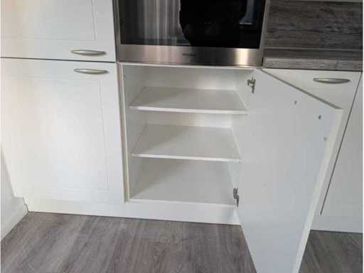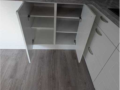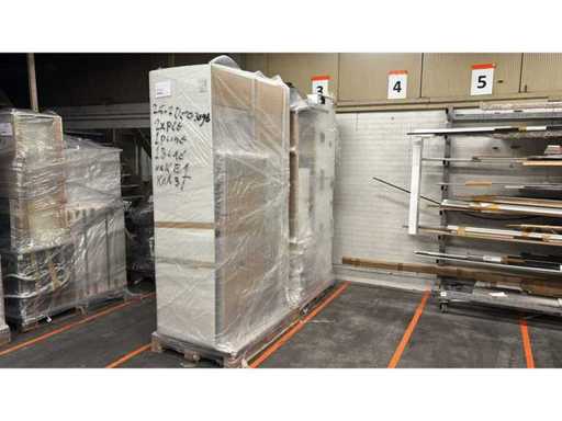 Condition: used; dimensions left part approximately 263x60x220 cm; dimensions right part approximately 336x60x90 cm; already disassembled and packed on pallets. (stacking, exchange or deposit per pallet); pallets are not included; pay a deposit when picking up, or stack pallets; Worktop not packed on pallets (25-2DE-03098)
