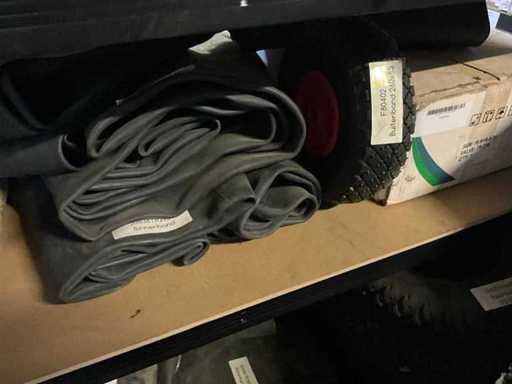 Consisting of lawnmower tyres 11x4.00-4 + 16.5x6.5-8 + 18x9.50-8 + 23x10.50-12, + large batch of various inner tubes for tractors and ride-on mowers,