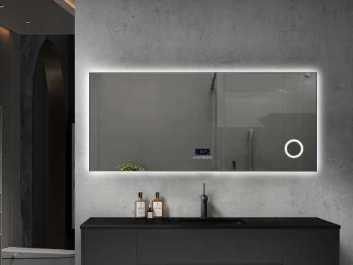 Dimensions wxh 80x70cm or wxh 120x70cm or wxh 160x70cm, led mirror with digital display and heating/bluetooth/speakers/clock/magnifying mirror, (you have the choice of 1 of these dimensions, please email your choice on info@mawialux.nl immediately after the auction closes), Heating Yes, Operation one-touch (for heater, lighting, bluetooth and settings), Mirror is finished with a very thin and neat aluminum housing in gunmetal grey color + a border acrylic behind which the LED strip neatly concealed. This acrylic edge is beautifully finished between the aluminum housing, In addition, it gives an extra dimension to the indirect lighting with 3 adjustable, and dimmable colors LED 3000/4500/6000K LED diodes (yellow/blue/white light), Equipped with digital display, bluetooth with 2 speakers, digital clock, temperature indication, 220volt plug (plug and play), heating to prevent condensation, integrated magnifying mirror of 10cm diameter with led lighting (magnifies 3x), 1.5mm copper-free with explosion-proof layer with the same function as tempered glass, suspension, Condition: New in box, Special features 2 year warranty, high quality, very exclusive mirror with many options, the mirror is equipped with an acrylic edge all around so that the LED lighting is not visible from the side