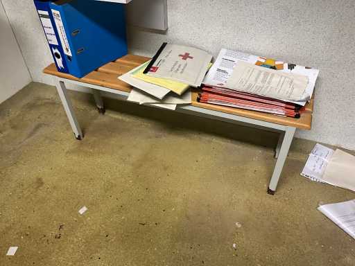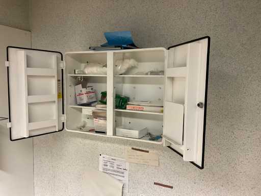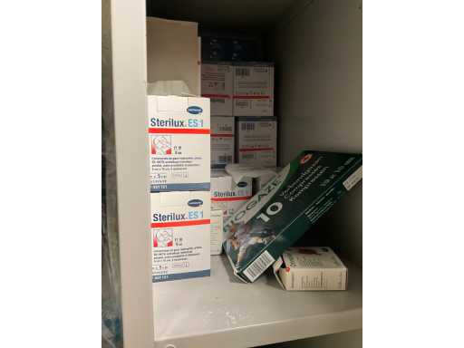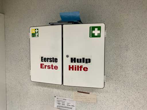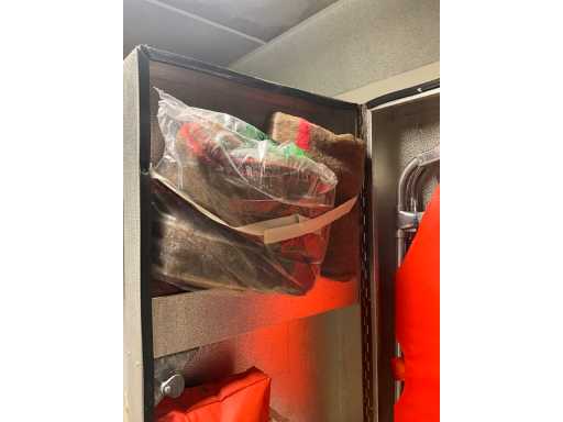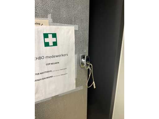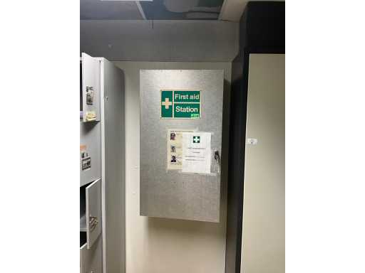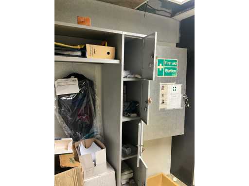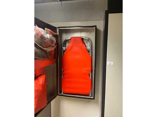 Locker cabinet MARCADET MOBILIER with dim plm:145x45x200cm containing various breathing masks, compresses, wooden bench, first aid cabinet, paper and soap dispenser, FIRST AID STATION with dim plm:61x25x110 cm stretcher and blankets, as visible on photo, located in first aid room