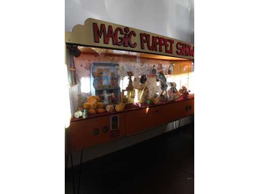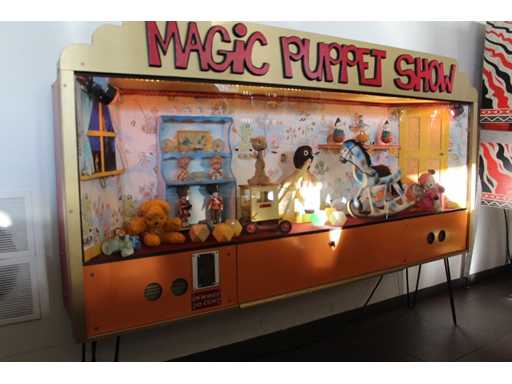 Playing and moving puppet theater from toy museum, music by means of 8 track player, after throwing in 50 euro cents the theater starts, very exclusive