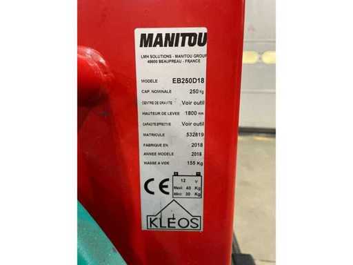 Accompanying electric stacker MANITOU KLEOS EB250 D18, designed for handling and stacking light loads. Compact, reliable and easy to use, it is ideally suited for workshops, storerooms, shops and small warehouses with limited space -Dimensions Overall width: approx. 710 mm Overall length: approx. 1,300 mm Fork spacing: approx. 519 mm Ground clearance: approx. 35 mm - Highlights Ideal capacity for light loads Compact size, small footprint Simple and ergonomic operation Recognized reliability of the MANITOU range Easy maintenance and reduced costs - Applications Small pallet handling Stacking in reserve or storage Workshops and technical areas Space-constrained environments - Status Good overall condition Functional Follow-up interview