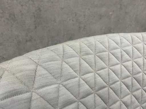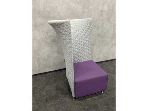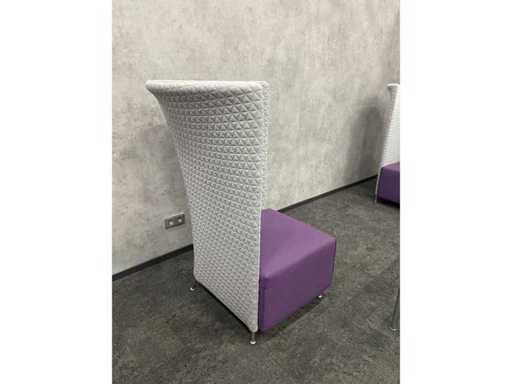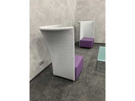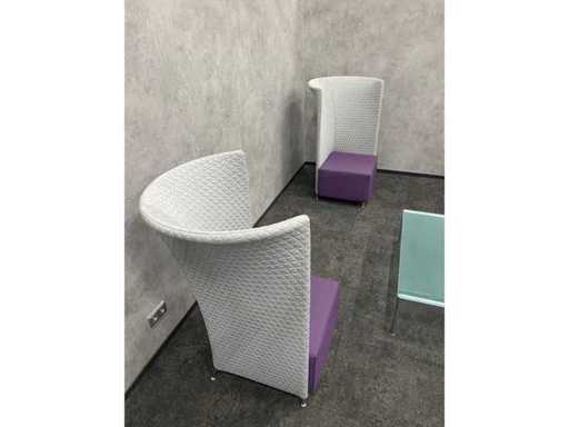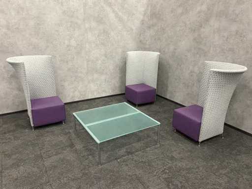 Lot consisting of 1x glass coffee table. Dim. approx. hxbxd 38x110x110 cm. ---- 3x Montis Scene design armchair with gray Triangle Grise upholstered backrest and a purple Tunus 505 upholstered seat.