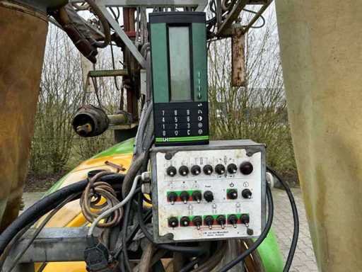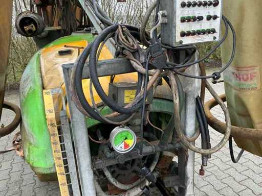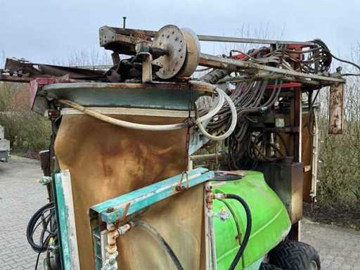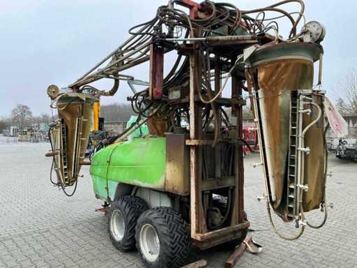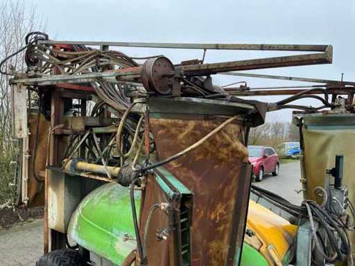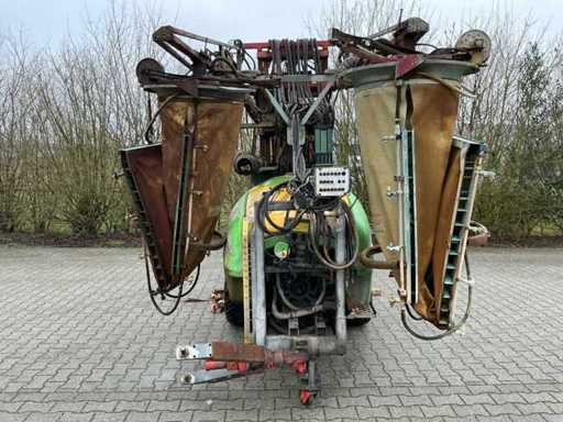 Suitable for a tree height of up to 3.50 meters, 120 liter clean water tank, 15 liter hand wash tank, Mechanical agitator; Sight glass at the front and side, Pump 4 cylinder piston diaphragm pump, capacity 104 ltr/min or 150 ltr/min 40 bar, 3 air pockets are mounted on the spray boom, These have a hydraulically driven fan and can be switched on and off separately, For this the sprayer has its own hydraulic system, Outer air pockets hydraulically movable for row distances from 2.90 to 3.50 meters, 6 tbsp. l Hydraulic operable functions for: high-low, folding and unfolding left and right, width adjustment left and right, folding / unrolling air pockets, 6 electric cranes and electric pressure regulator, Control box in the front of the tractor to control all hydraulic and electrical functions, 16 Trimatic non-drip nozzle holders per air pocket, Lighting, Tandem axle with 4 tires 295 x 50R15, track width is adjustable, Double Wide-angle PTO shaft