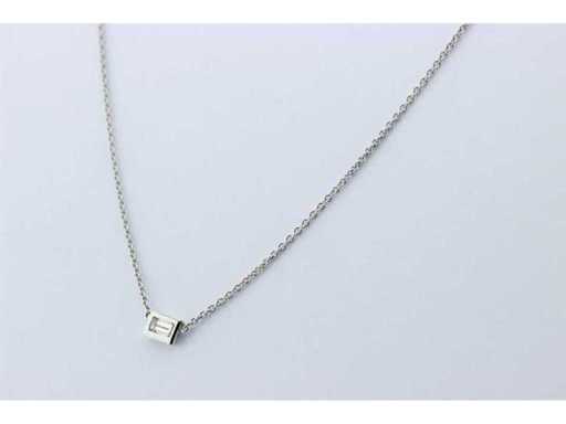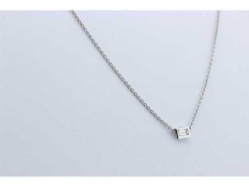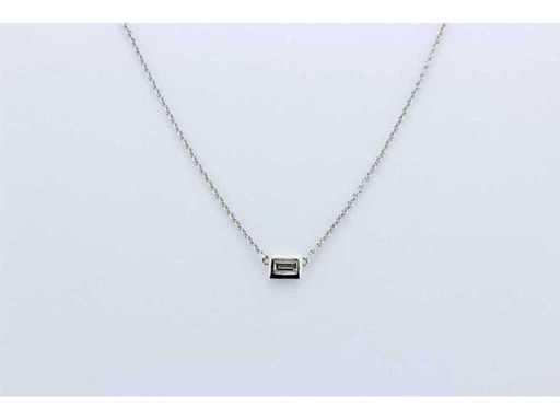 14 carat white gold pendant set with 1 baquette cut diamond with a weight of 0.15 crt. Color G and quality VS hanging on a 14 carat white gold anchor necklace. Includes a necklace box and an appraisal report with an insurance value of € 975,-- issued by a qualified appraiser. Gemstone: Natural diamond