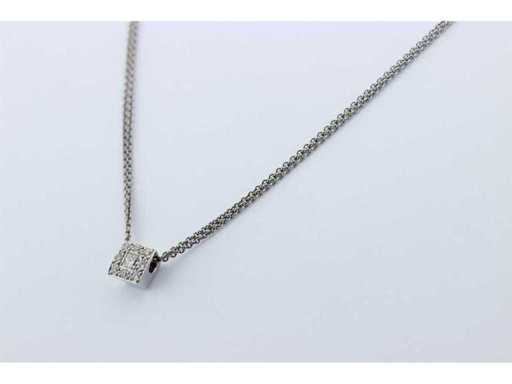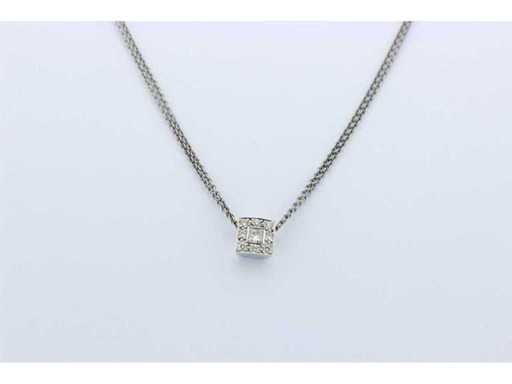 14 karat white gold rosette pendant set with 1 princess cut diamond weighing 0.10 crt Around this are 8 brilliant cut diamonds with a weight of 0.08 ct. Color G and quality VS hanging on a 14 carat white gold cut bar necklace. Includes a necklace box and an appraisal report with an insurance value of € 1850,-- issued by a qualified appraiser. Gemstone: Natural diamond