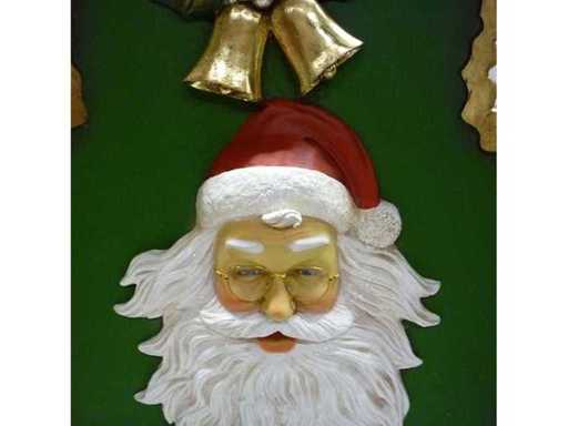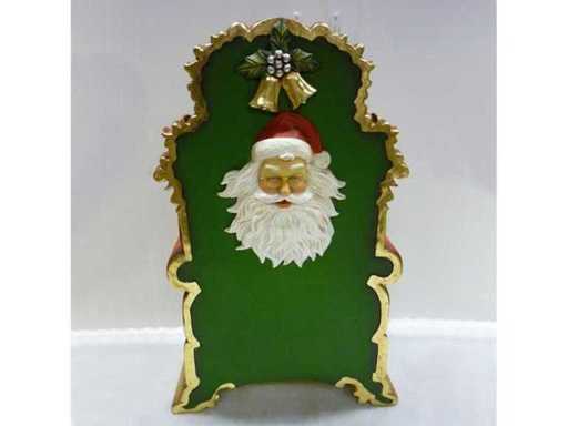 Decorative throne in resistant resin, hand-painted with detailed finishes, incorporating the head of a Santa Claus on the back. Dimensions suitable for indoor use, ideal for shop windows, decorated entrances or themed tours in shopping malls. Structuring decorative seat, designed to enhance and organize a winter visual space.