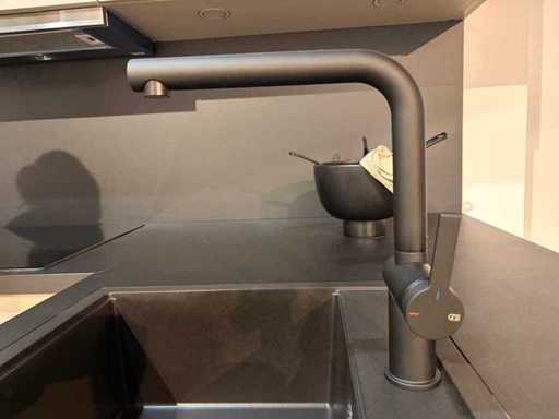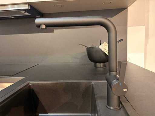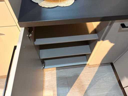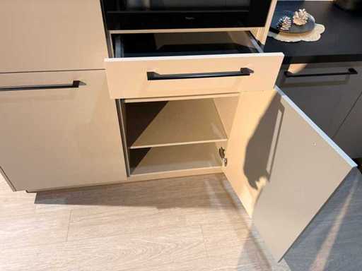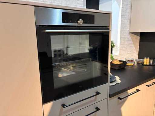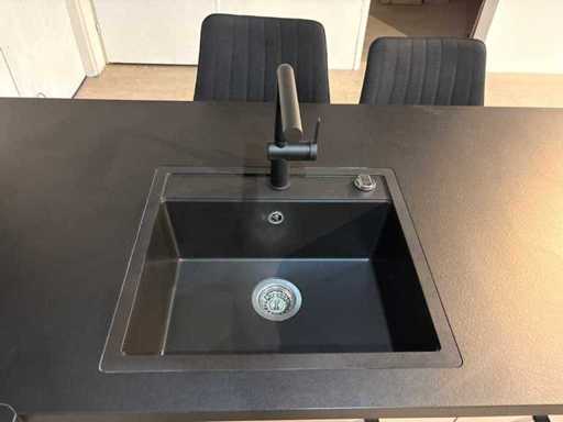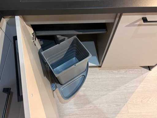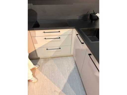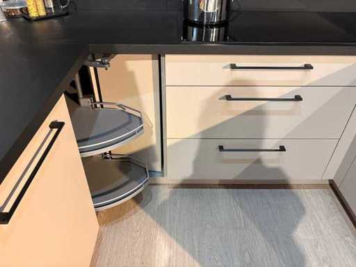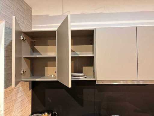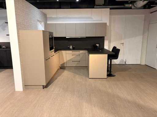 Dimensions left part approximately 273x60x163 cm; dimensions middle part approximately 271x60x92 cm; dimensions peninsula approximately 185x87x93 cm; Kitchen needs to be dismantled on location on the first floor; without bar stools