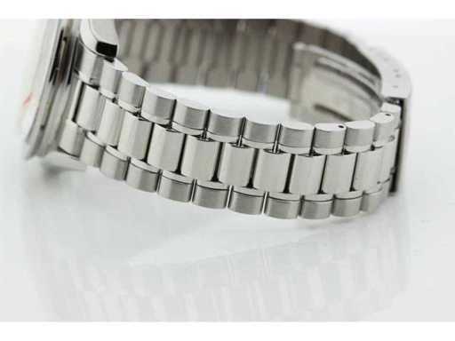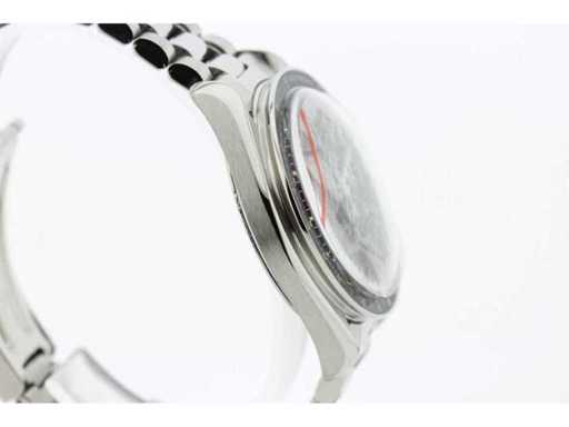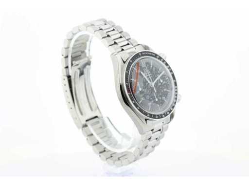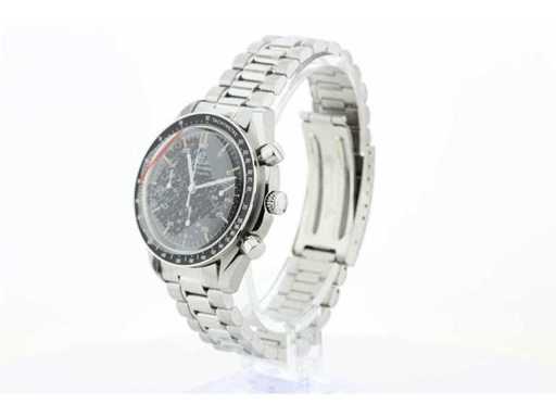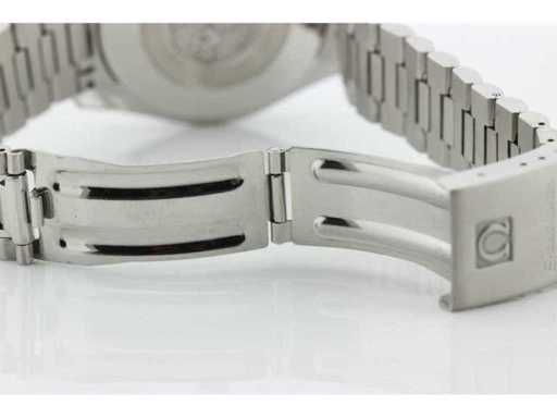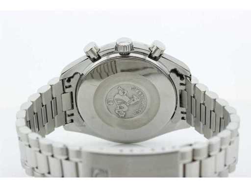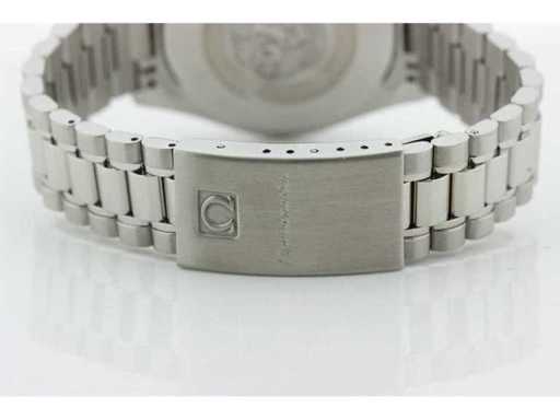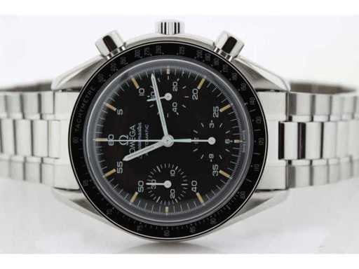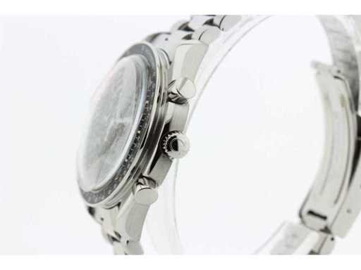 Omega speedmaster reduced chronograph, made around 1980. Beautiful and rare, water-resistant stainless steel wristwatch with round button chronograph, registers and tachometer. Watch case polished, screwed back, polished lugs. Black dial with applied steel bar indexes and luminous dots, outer 1/5-second indication and tachometer with scale up to 700 μph, sub-dials for the constant second hand, the 12-hour and 30-minute registers. Recent service by Omega service center (€ 1230,--), fully restored to new condition, box and two-year worldwide warranty Functions: Hour, minute, days chronograph Height: 13 mm Wrist circumference: 18 cm