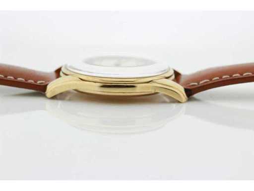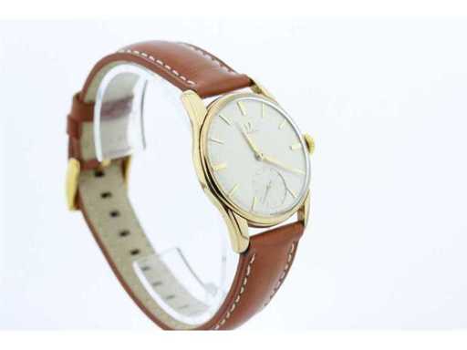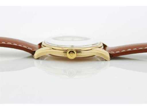Vintage Omega 9 karat yellow gold men's wristwatch with cream dial with second hand on the six, equipped with a leather strap and double Omega buckle. Runs perfectly +7 seconds a day. We expressly guarantee its authenticity, and you can have it verified by an Omega retailer. Waterproofing not guaranteed if stated. Includes original omega service packaging. Functions: Hour, minute and second Movement type: mechanical Height: 8.8 mm Wrist circumference: 18 cm