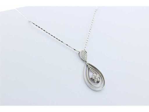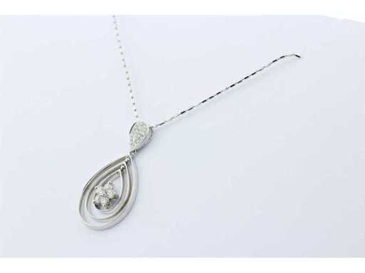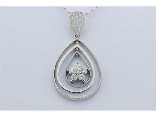 18 carat white gold oval rosette pendant set with 26 brilliant cut diamonds weighing 0.40 crt. Colour G and quality VS hanging on a 14 carat white gold necklace. Includes a necklace box and a valuation report with an insurance value of € 1695,-- issued by a qualified appraiser. Gemstone: Natural diamond Quantity: 16 Cut: Brilliant Weight: 0.40 Color: G Purity: VS Length: 44 cm.