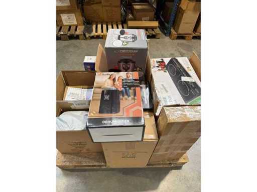 Pallet met een gevarieerde mix van consumentenelektronica en huishoudtoestellen, ideaal voor doorverkoop of handel.