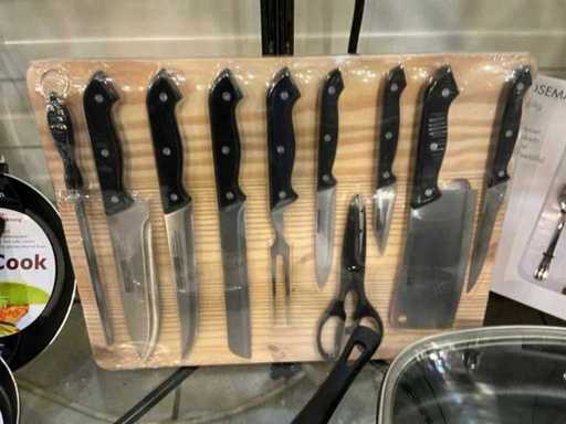 Complete with knife set 10 pieces with board and 24-piece cutlery and holder with spoon, various pans and square sauté pan 28 x 28 with glass lid Standing on 1 shelf Issue according to instructions