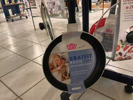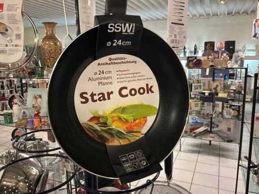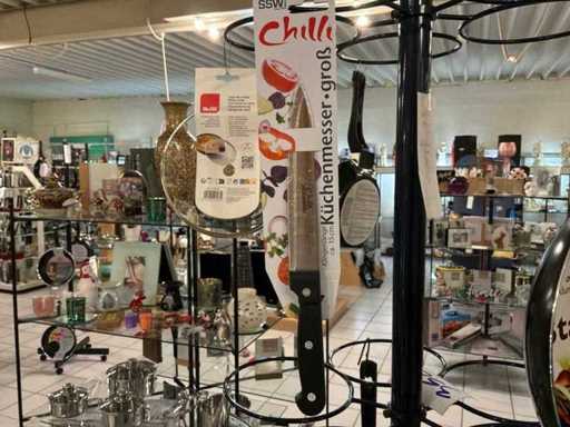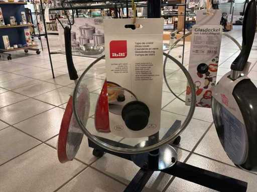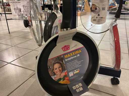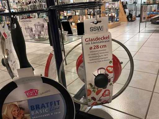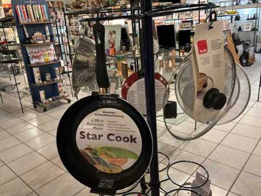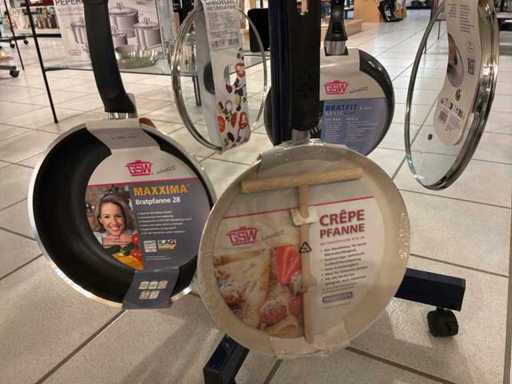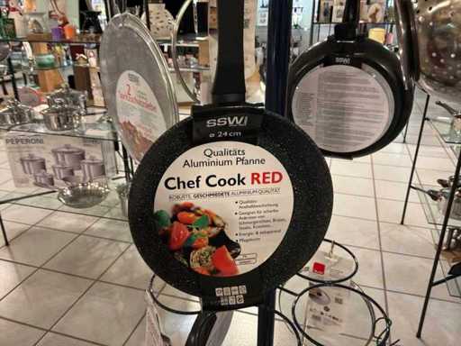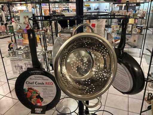 Diameters pans: 1x 16 cm, 2x 24 cm, 3x 28 cm, 1x pancake pan, various professional knives, colander, glass lids...