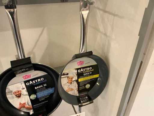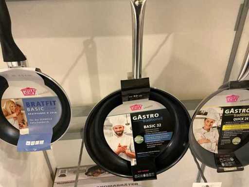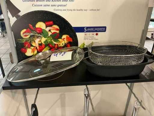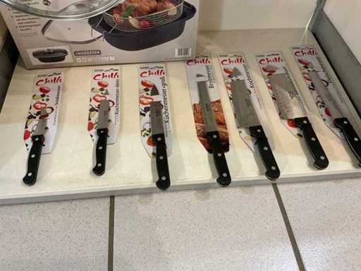 Frituese, various pans in different sizes, professional knives, glass lid....