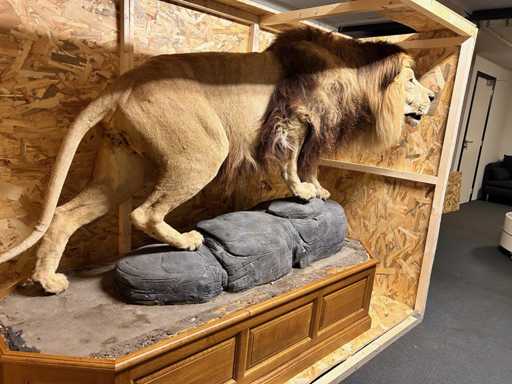 Taxidermy of an African lion (Panthera Leo, Full body mount).