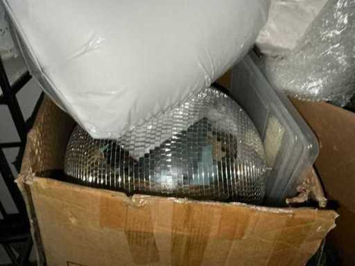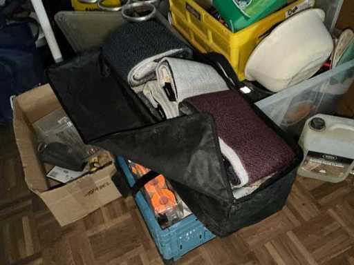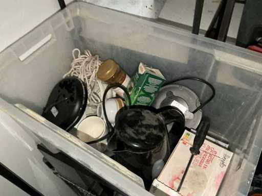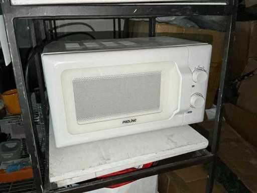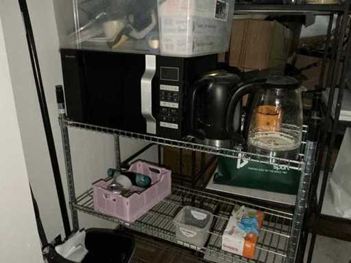 Large batch of various including 3 metal racks each of dimensions approximately 48 x 45 x 200 cm, 2 microwave ovens including 1 SHARP and 1 PROLINE, 3 various kettles, vacuum cleaner NILFISK, standing coat rack, 3 ice buckets, 2x wooden sidewalk sign, disco ball, batch of Christmas decoration, beige lighting, PVC storage boxes, and so on