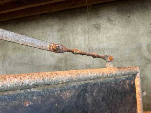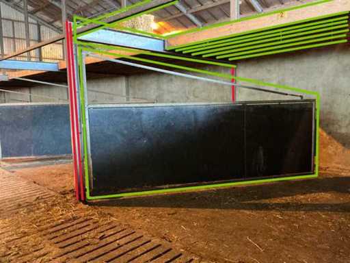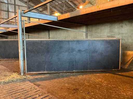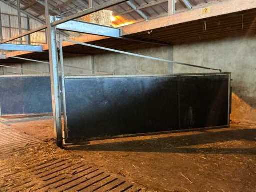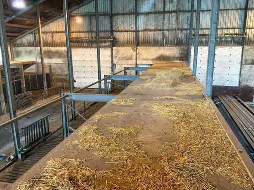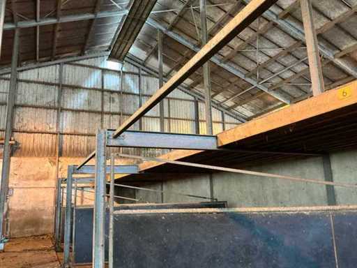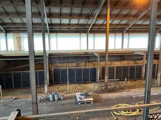 Consists of: complete stable equipment consisting of 6 steel swing gates, associated steel construction (main supporting structure) and wooden floor/beam layer, construction made of heavy agricultural quality, suitable for reconstruction or reuse, gates 6 pieces, steel swing gates, dimensions per gate: width: 4,800 mm, height: 1,650 mm, height tube construction: 2,500 mm, hinges: 4 per gate, hinge pin: Ø approx. 100 mm, length: 2,500 mm, Fixed with 10 bolts per hinge arrangement, Welded and galvanized steel construction, Heavy industrial/stable application, Steel construction (main load-bearing structure) Truss width: 4,885 mm, Truss profile: 135 mm wide, 270 mm high, Box sections: 70 x 70 mm, Length: 4,900 mm, H-beams: 5 pieces, Uprights: 5 pieces (Note: uprights are anchored in concrete and are not part of the sale, Construction executed with welded and bolted connections, wooden floor/beam layer, wooden beams: 60 pieces, dimensions: 220 x 70 mm, length: 4,900 mm, underlayment plates: 24 pieces, additional 4 plates, used as load-bearing floor construction, steel gates: ± 3,000 – 3,600 kg, steel construction (beams, tubes, H-beams): ± 2,000 – 2,500 kg, wooden beams and plates: ± 3,000 – 3,500 kg, total estimated weight: approx. 8,000 – 9,500 kg, total length of installation: approx. 29 meters, See photo 2, parts marked in red, are not part of the purchase, see lot 208 for the same setup.