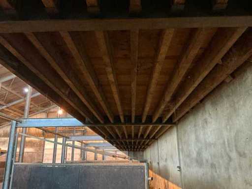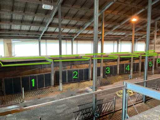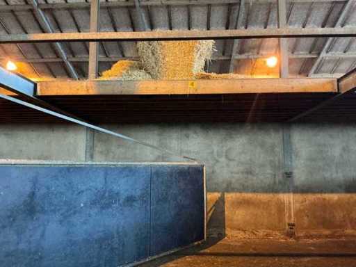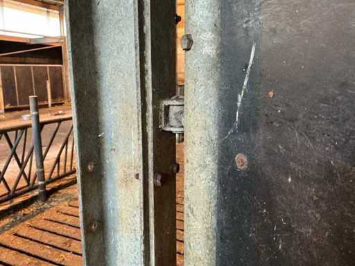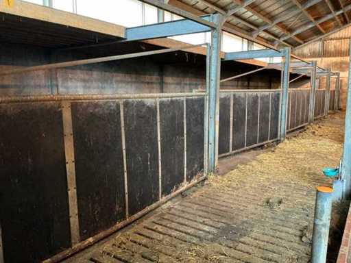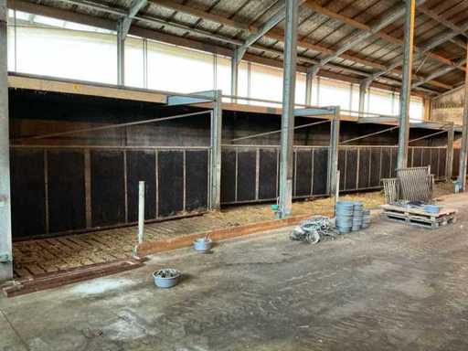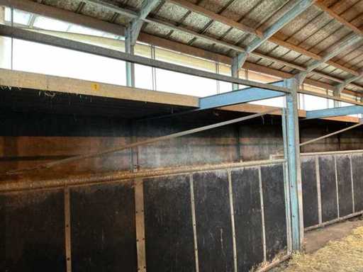 Consists of: complete stable equipment consisting of 6 steel swing gates, associated steel construction (main supporting structure) and wooden floor/beam layer, construction made of heavy agricultural quality, suitable for reconstruction or reuse, gates 6 pieces, steel swing gates, dimensions per gate: width: 4,800 mm, height: 1,650 mm, height tube construction: 2,500 mm, hinges: 4 per gate, hinge pin: Ø approx. 100 mm, length: 2,500 mm, Fixed with 10 bolts per hinge arrangement, Welded and galvanized steel construction, Heavy industrial/stable application, Steel construction (main load-bearing structure) Truss width: 4,885 mm, Truss profile: 135 mm wide, 270 mm high, Box sections: 70 x 70 mm, Length: 4,900 mm, H-beams: 5 pieces, Uprights: 5 pieces (Note: uprights are anchored in concrete and are not part of the sale, Construction executed with welded and bolted connections, wooden floor/beam layer, wooden beams: 60 pieces, dimensions: 220 x 70 mm, length: 4,900 mm, underlayment plates: 24 pieces, additional 4 plates, used as load-bearing floor construction, steel gates: ± 3,000 – 3,600 kg, steel construction (beams, tubes, H-beams): ± 2,000 – 2,500 kg, wooden beams and plates: ± 3,000 – 3,500 kg, total estimated weight: approx. 8,000 – 9,500 kg, total length of installation: approx. 29 meters, See photo 2, parts marked in red, are not part of the purchase, see lot 207 for the same setup.